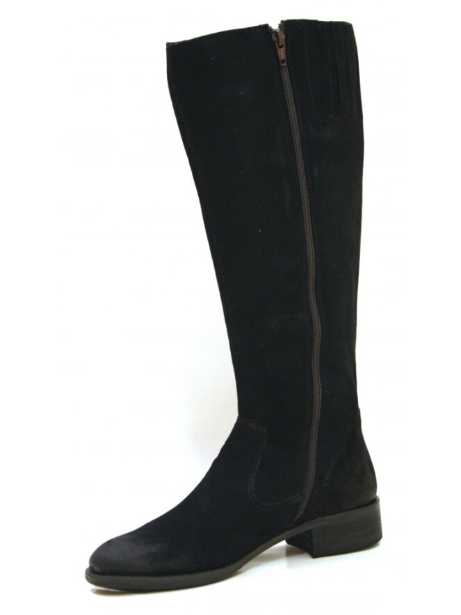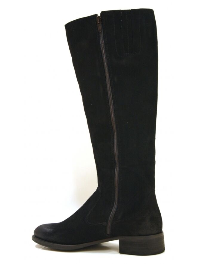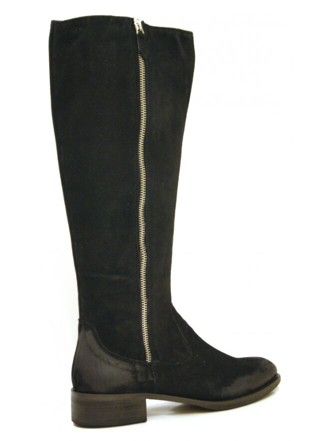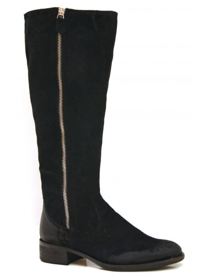Een hoge laars van het merk Planeta in de kleur cognac. Aan de buitenzijde van de laars is een zilver kleurige sierrits en aan de binnenzijde een bruine rits. Het suède is op de voorvoet licht geschuurd. Aan de bovenzijde van de schacht is een dubbele insnijding met elastiek.