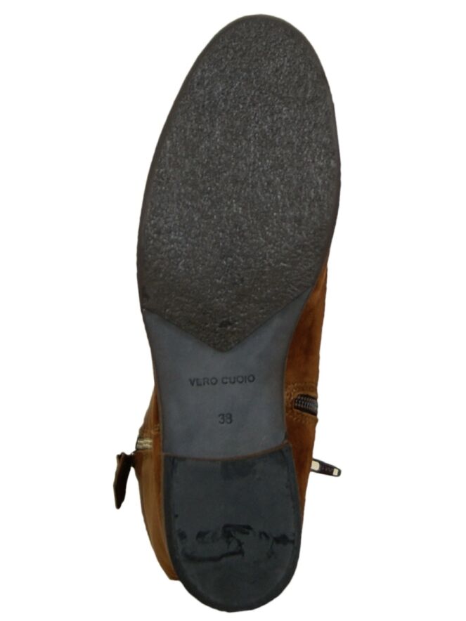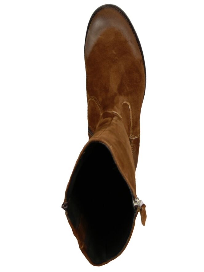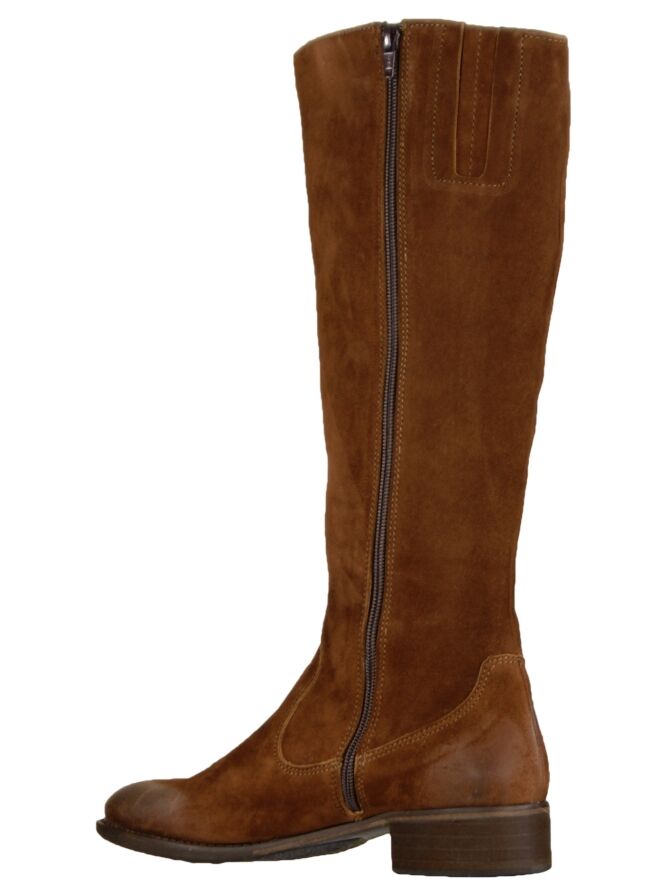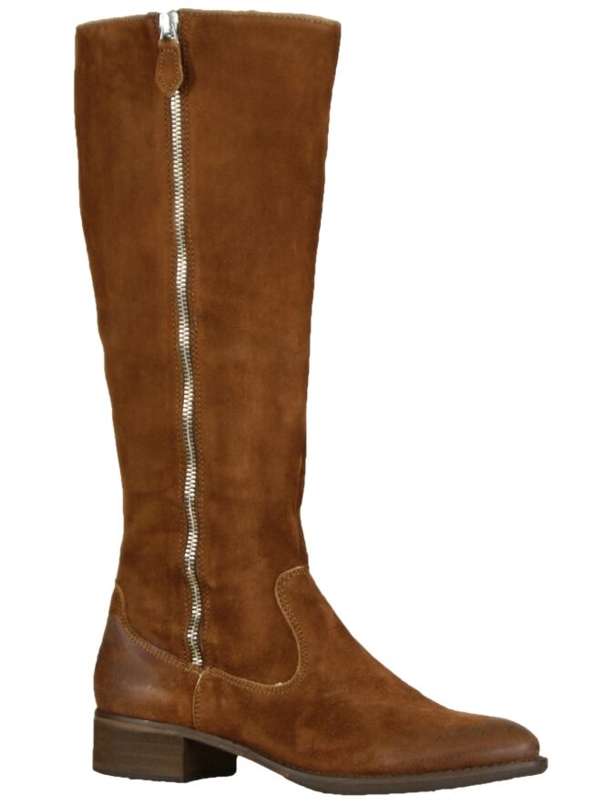 Een hoge laars van het merk Planeta in de kleur cognac. Aan de buitenzijde van de laars is een zilver kleurige sierrits en aan de binnenzijde een bruine rits. Het suède is op de voorvoet licht geschuurd. Aan de bovenzijde van de schacht is een dubbele insnijding met elastiek. De schachthoogte is 44 cm en de schacht breedte is 40 cm.