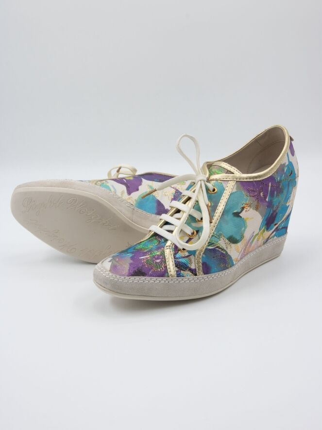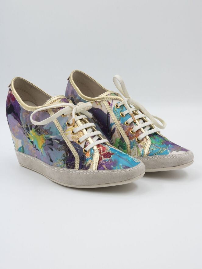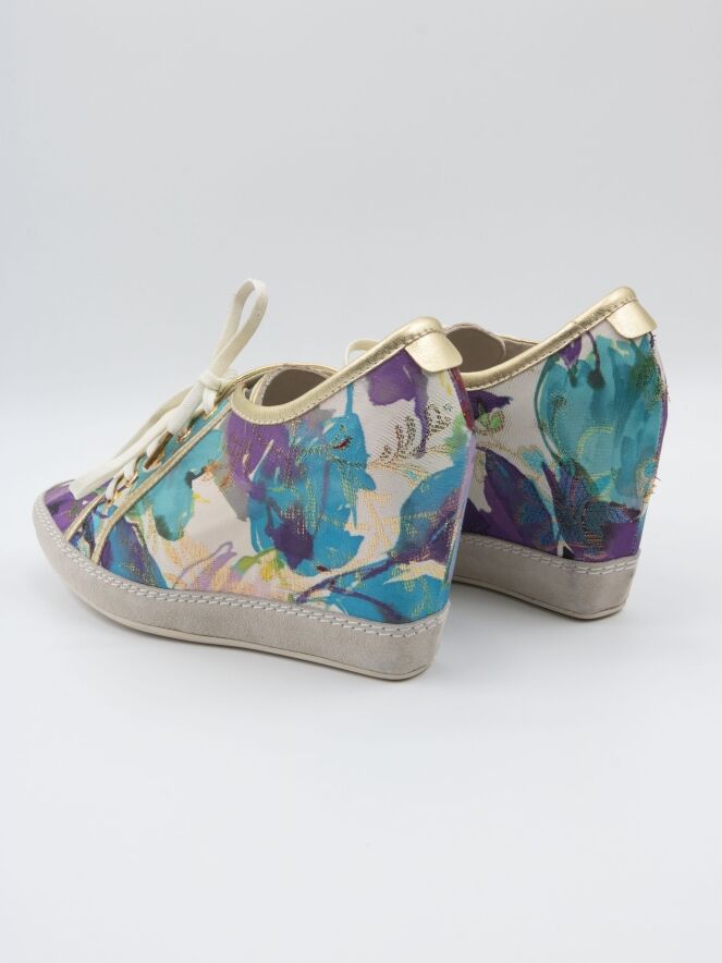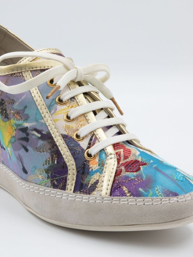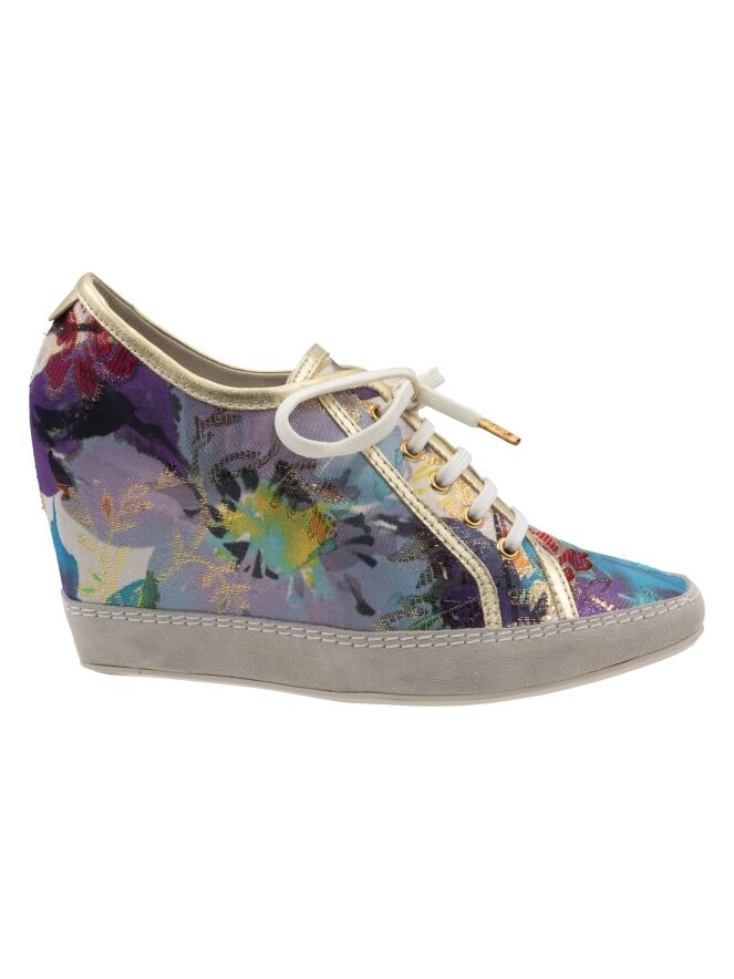 Een veterschoen van Pons Quintana op een sleehak met een multicolor bloemenprint. De biezen zijn in een platinakleur. De rand van de zool is lichtgrijs. De binnenkant is ongevoerd.