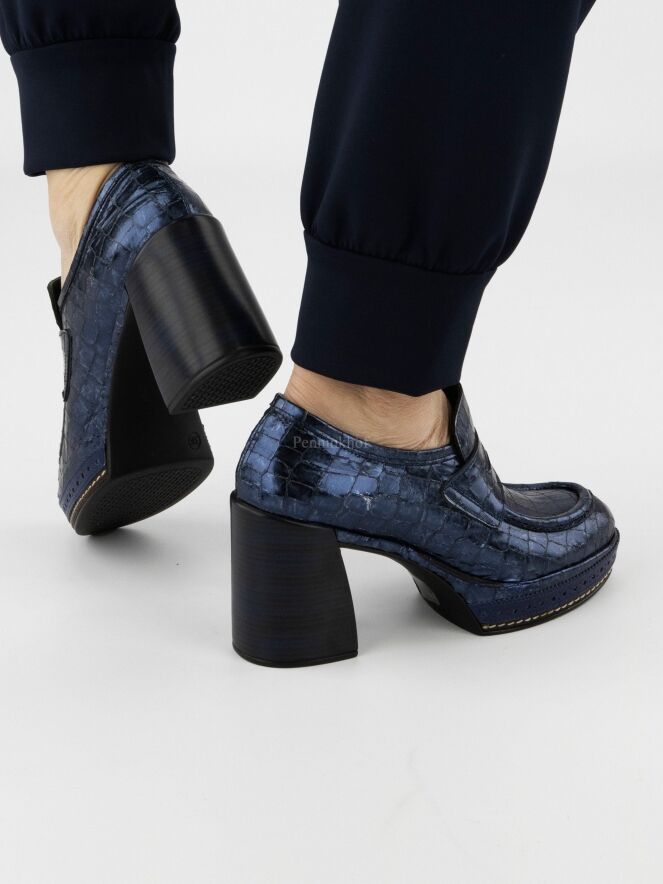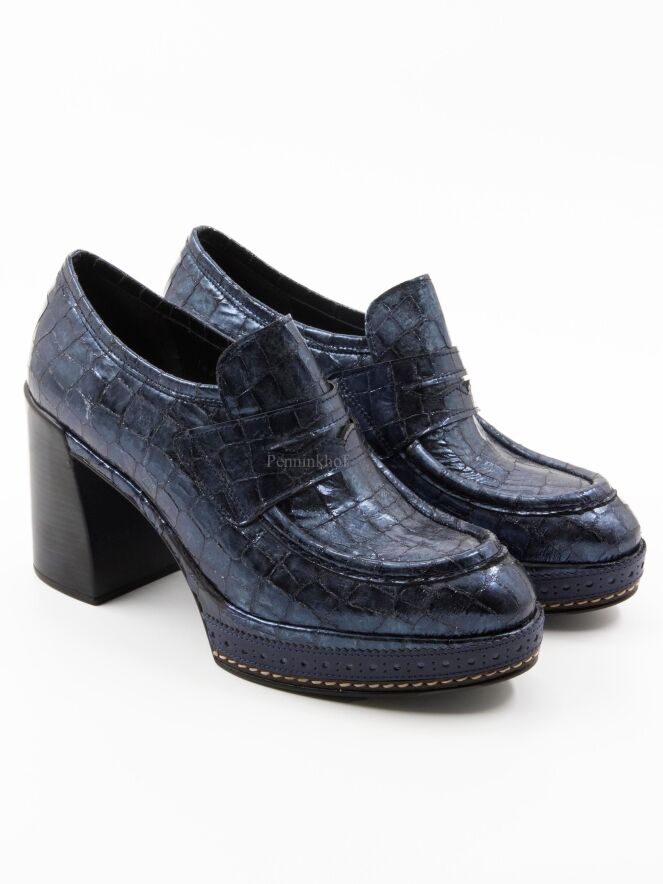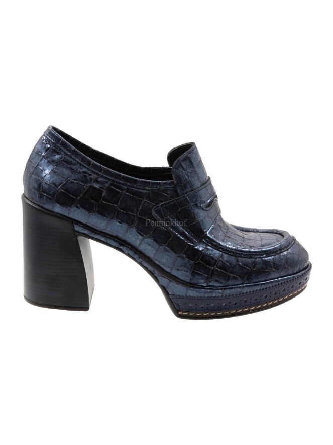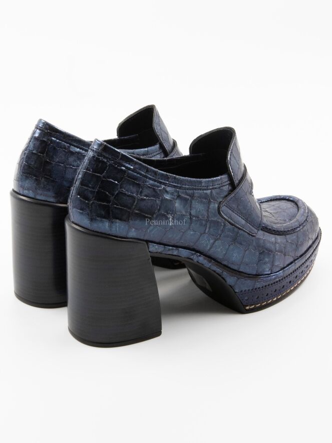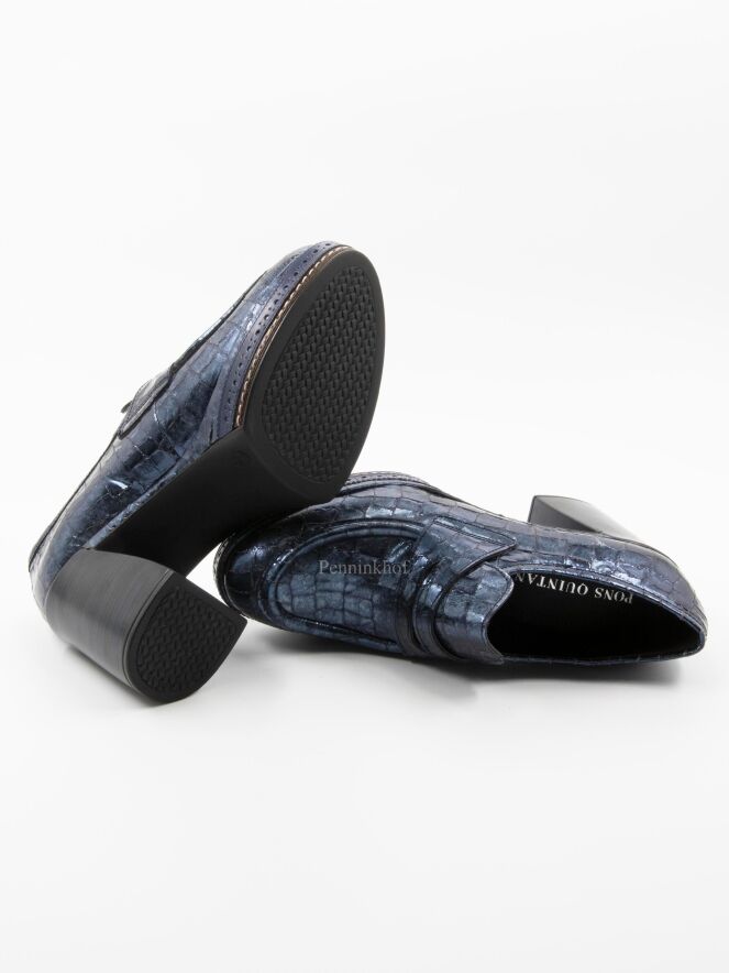 Een instapper op een hoge blokhak van Pons Quintana in een croco print in de kleur petrol blauw. De blokhak is in een neutrale zwarte kleur. Langs de rand aan de onderzijde van de plateauzool is een decoratieve stiknaad. De binnenzijde is met leder gevoerd.