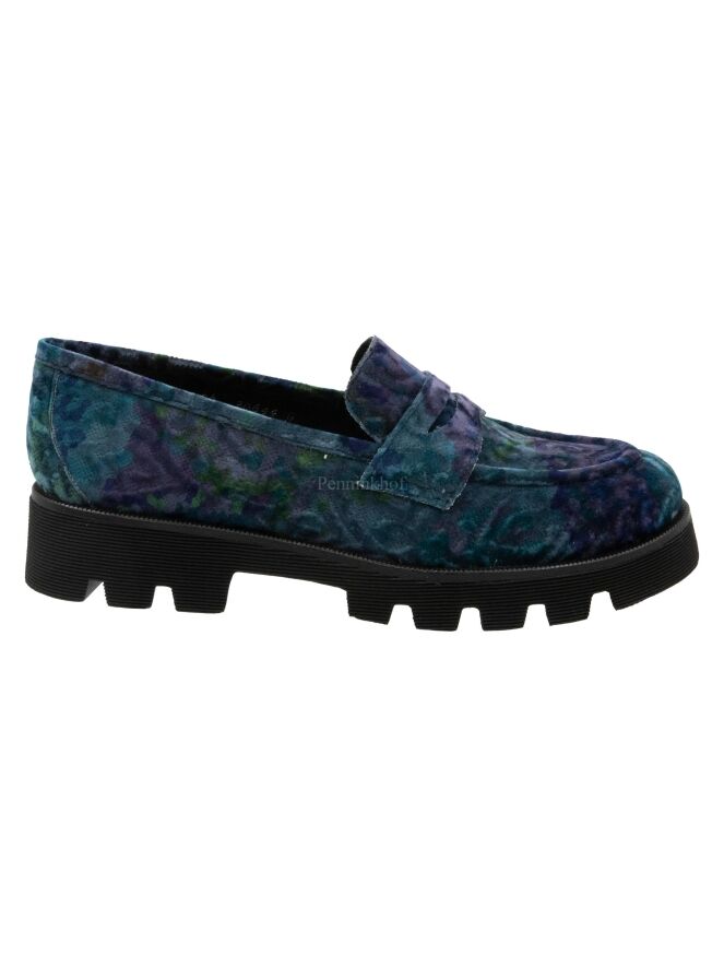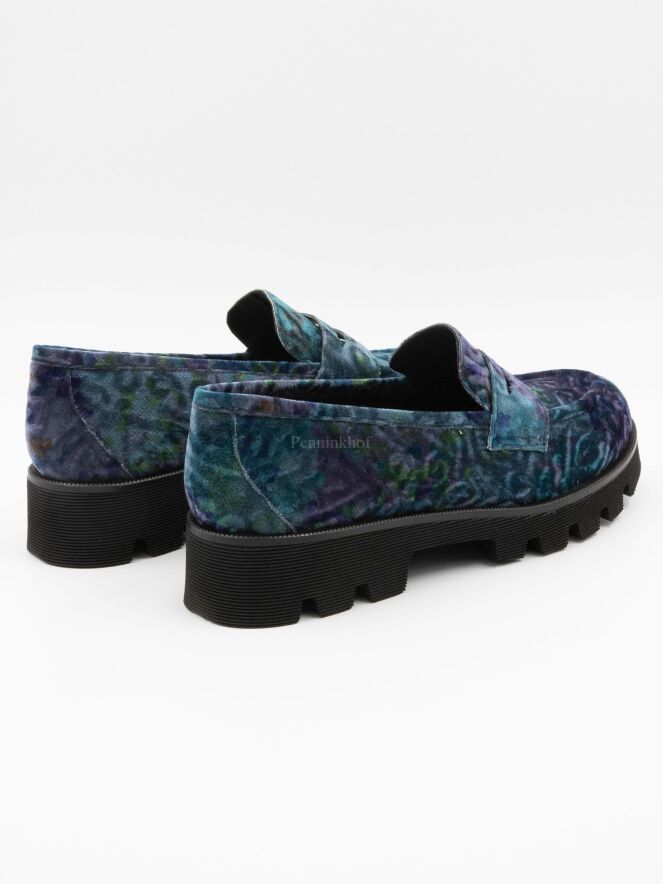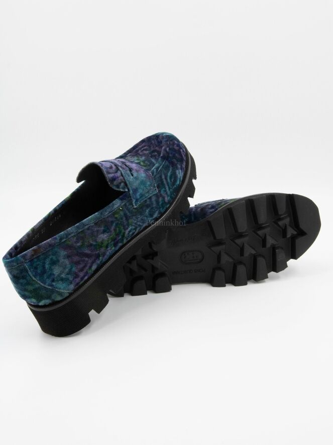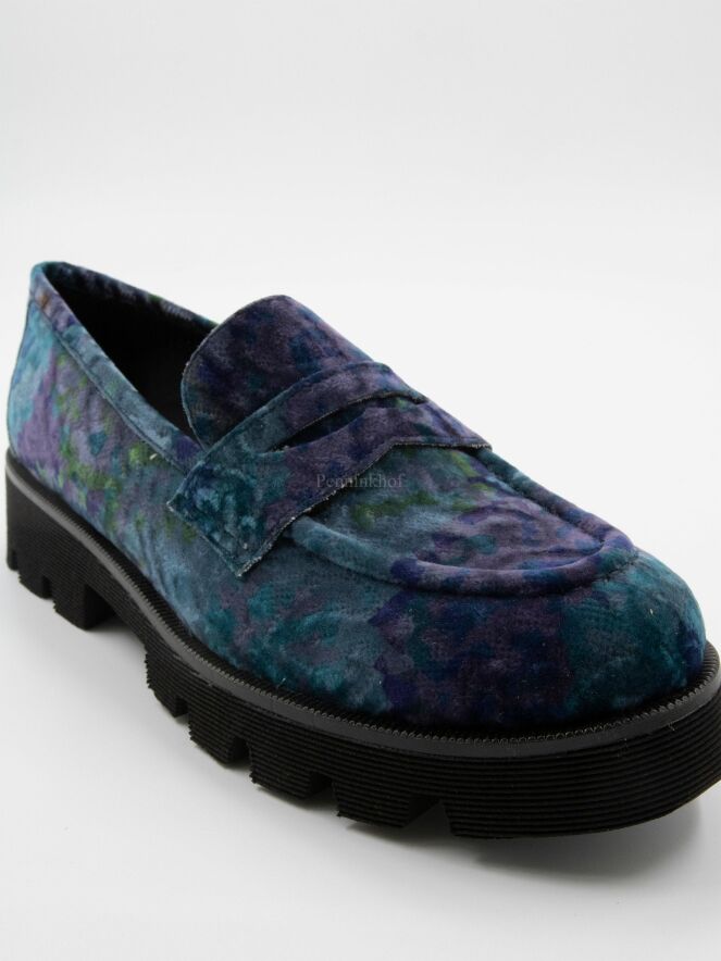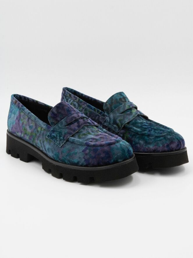 Een instapper van Pons Quintana in een velour kwalliteit met een grafische print met meerdere tinten paars, turquoise en groen. De zwarte zool is grof gekarteld en de binnenkant is met leder gevoerd.