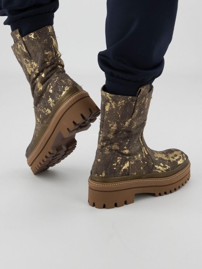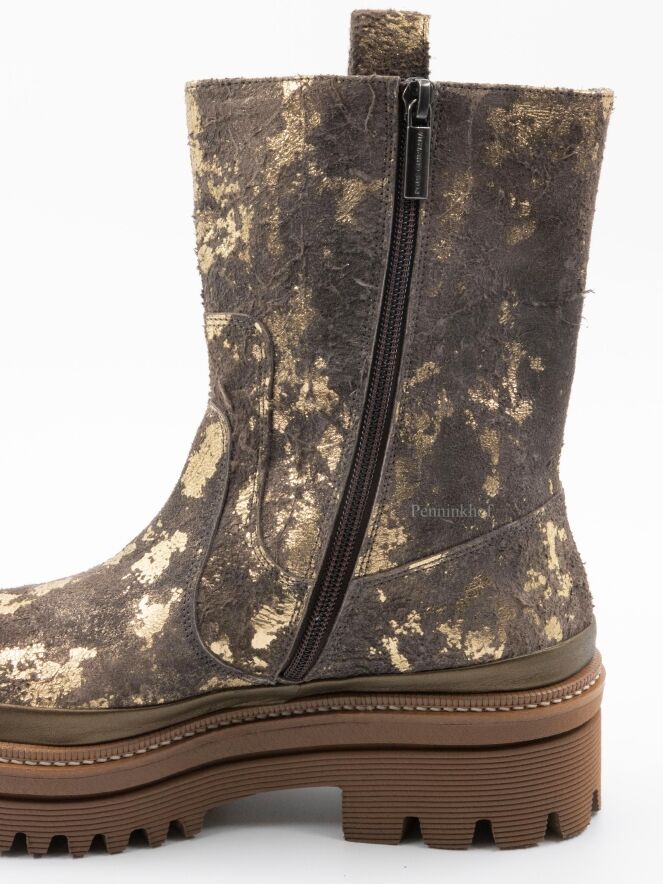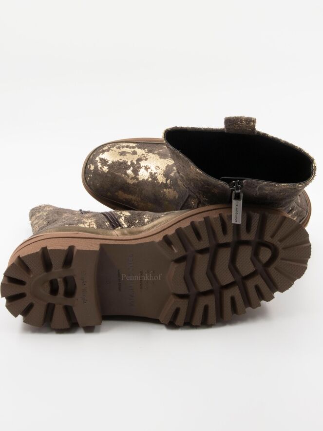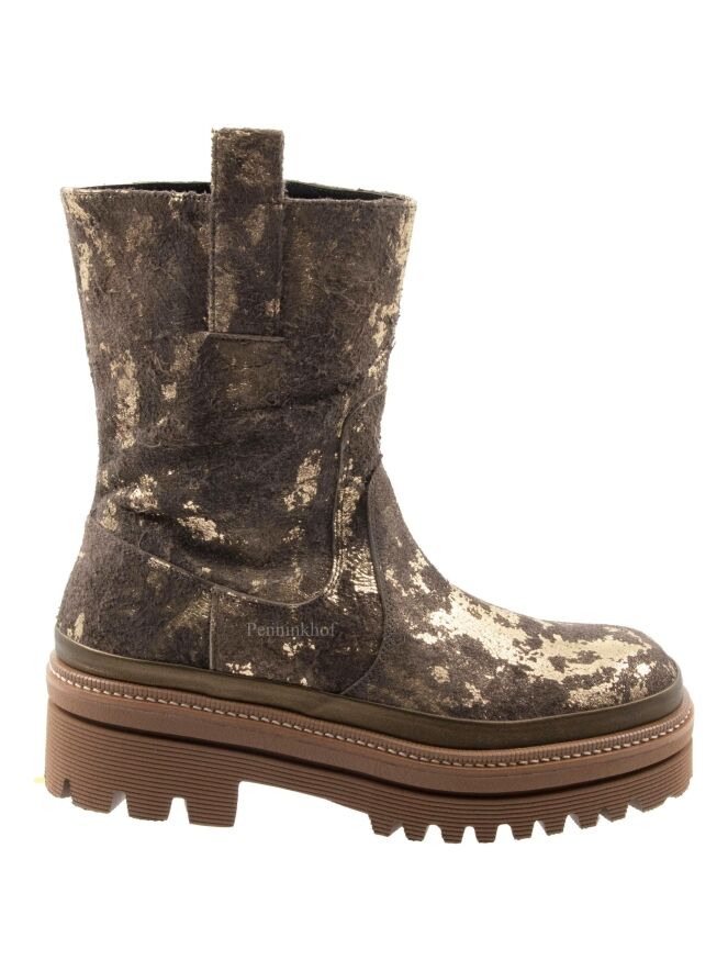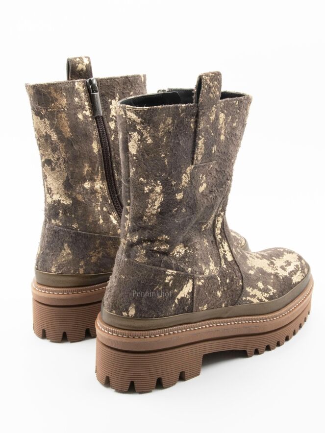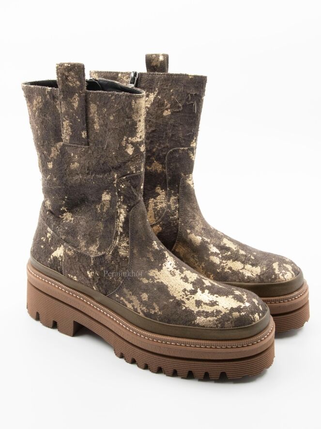 Een halfhoge laars van Pons Quintana in een geschrobt leder met meerdere tinten brons en taupe. De plateauzool is in meerdere tinten camel met een decoratieve stiknaad.
