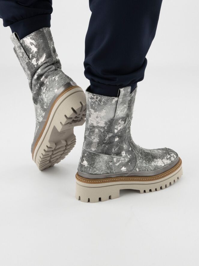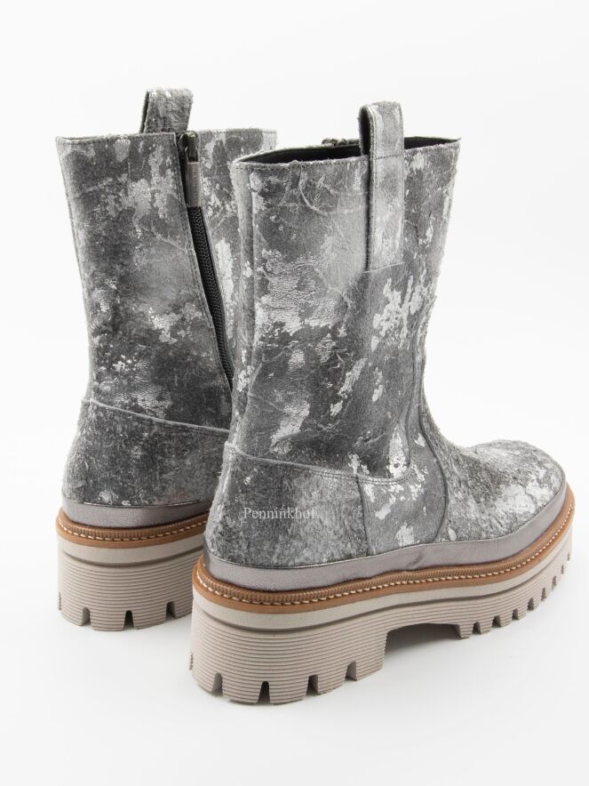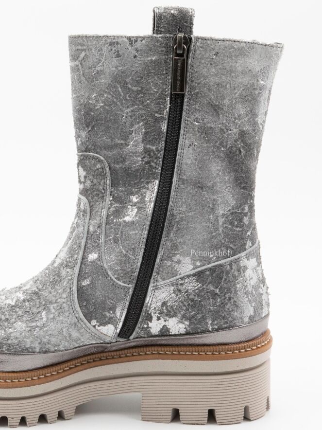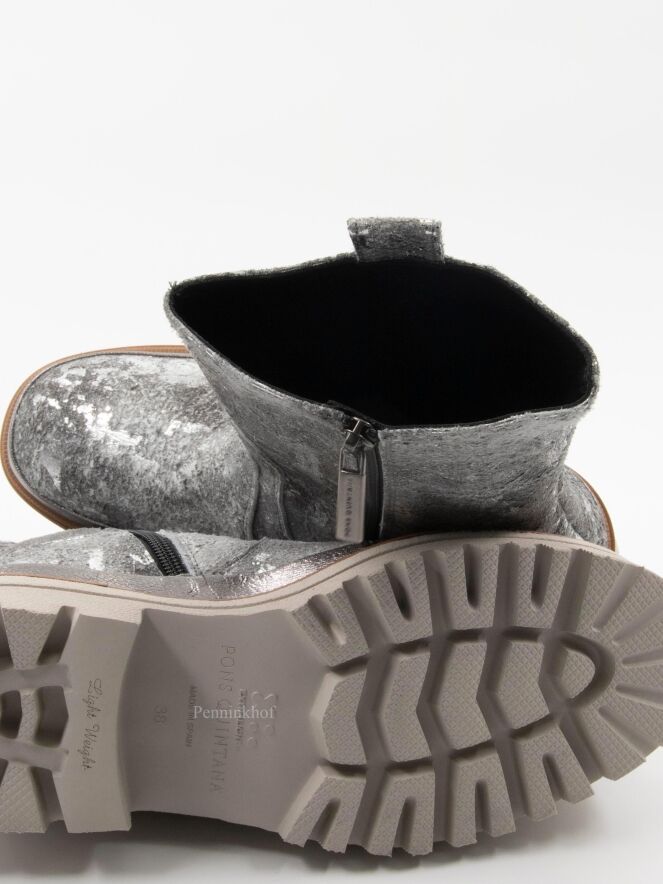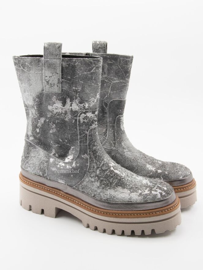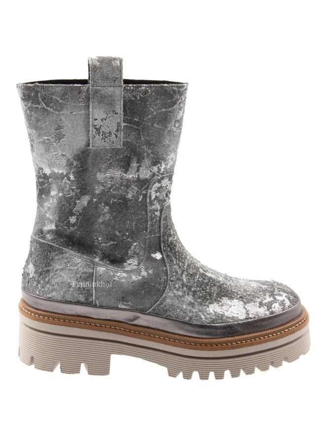 Een halfhoge laars van Pons Quintana in een geschrobt leder met meerdere tinten zilver en grijs. De plateauzool is in meerdere tinten grijs met een camelkleurige bies met een decoratieve stiknaad.