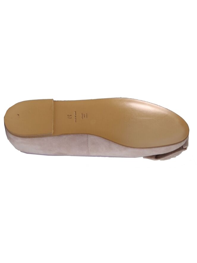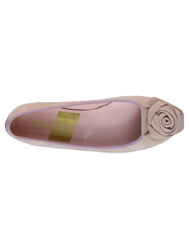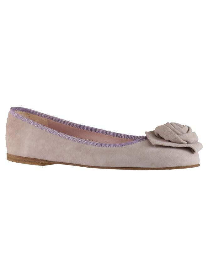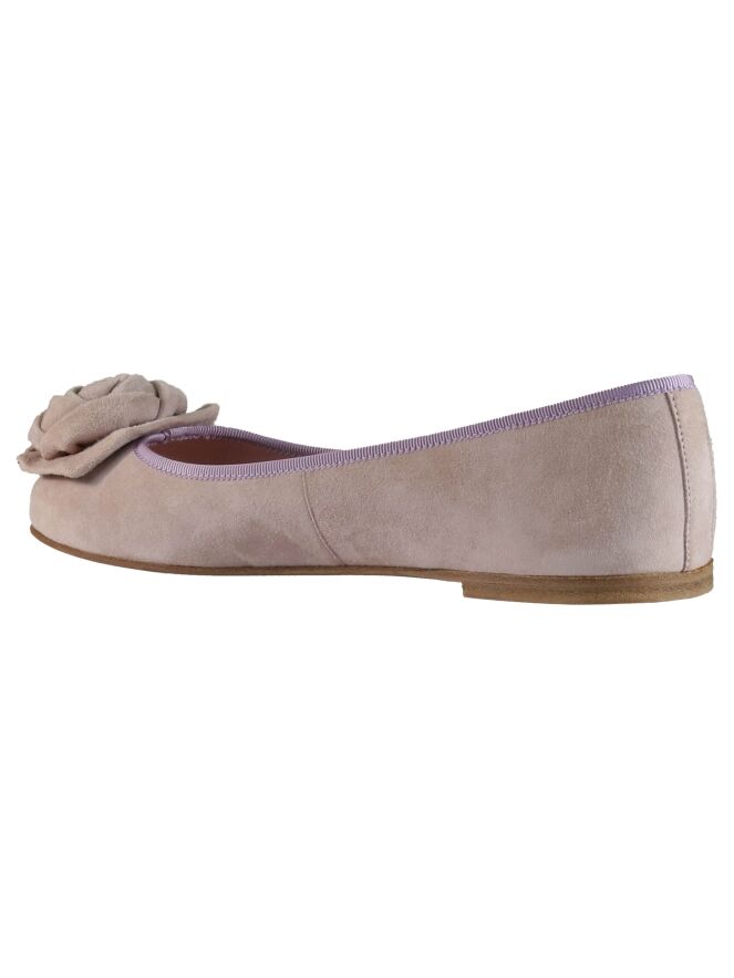 Een ballerina van Pretty Ballerina's in een pastel roze kleur. Op de voorvoet is een becoratieve roos. De randen zijn in een lila kleur afgestikt. De binnenkant is met leder gevoerd.