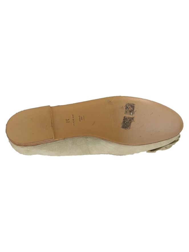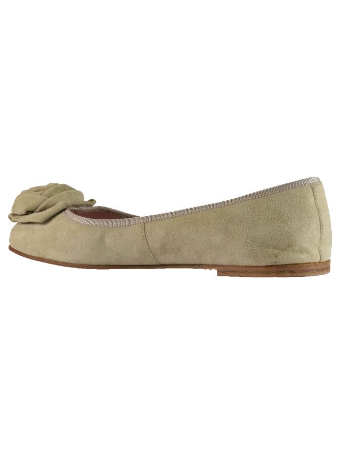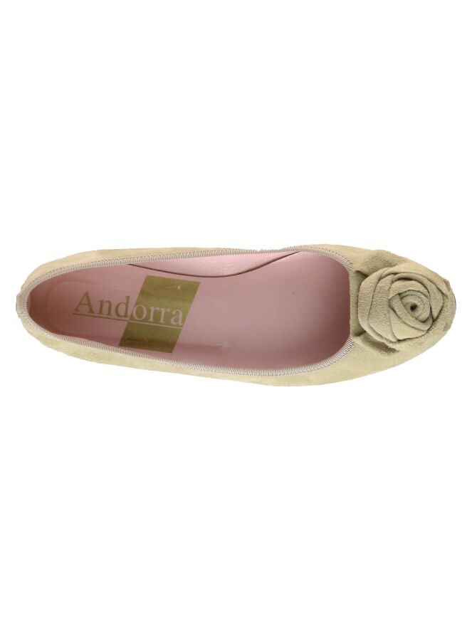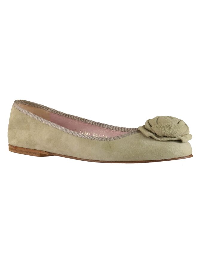 Een ballerina van Pretty ballerina's in de kleur beige. Op de voorvoet is een decoratieve roos in suède. Langs de rand van de schacht is een gestikte lederen bies. De binnenkant is met leder gevoerd.