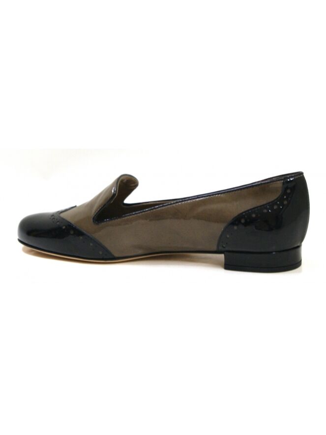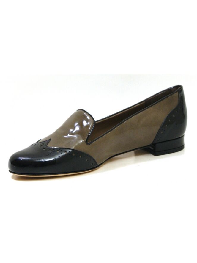 Een instapper van het merk Prezioso in een taupe kleur. De instappers heeft brooks details. De hiel en het neusje is in zwart lak leder. Langs de boord van de instapper is een zeer smalle bies in leder. De binnenkant van de schoen is met leder gevoerd.