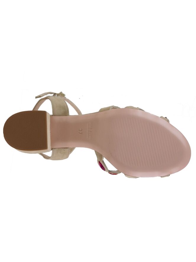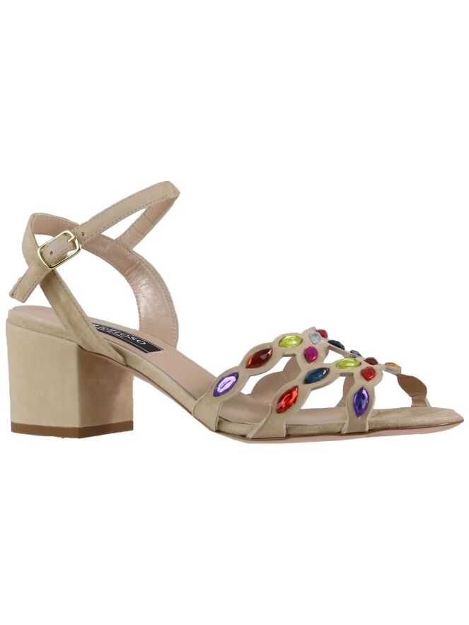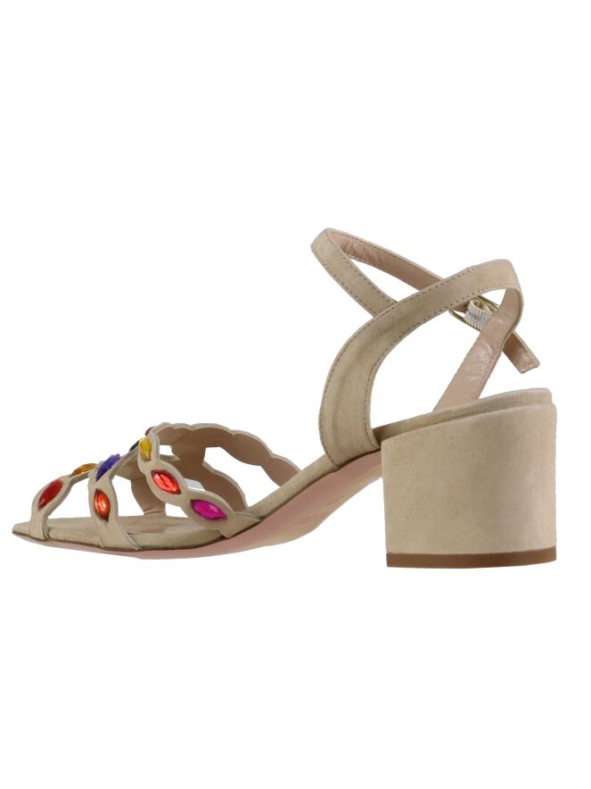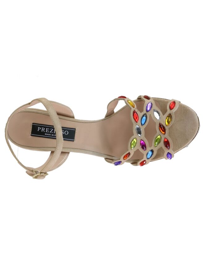 Een open pump van Prezioso in de kleur beige. Over de voorvoet is het suède uitgesneden en over de diagonale lijnen zijn strassteentjes in frisse kleuren. De elegante blokhak is in het zelfde materiaal als de pump. De pump heeft een hielbandje en een verstelbaar riembandje.