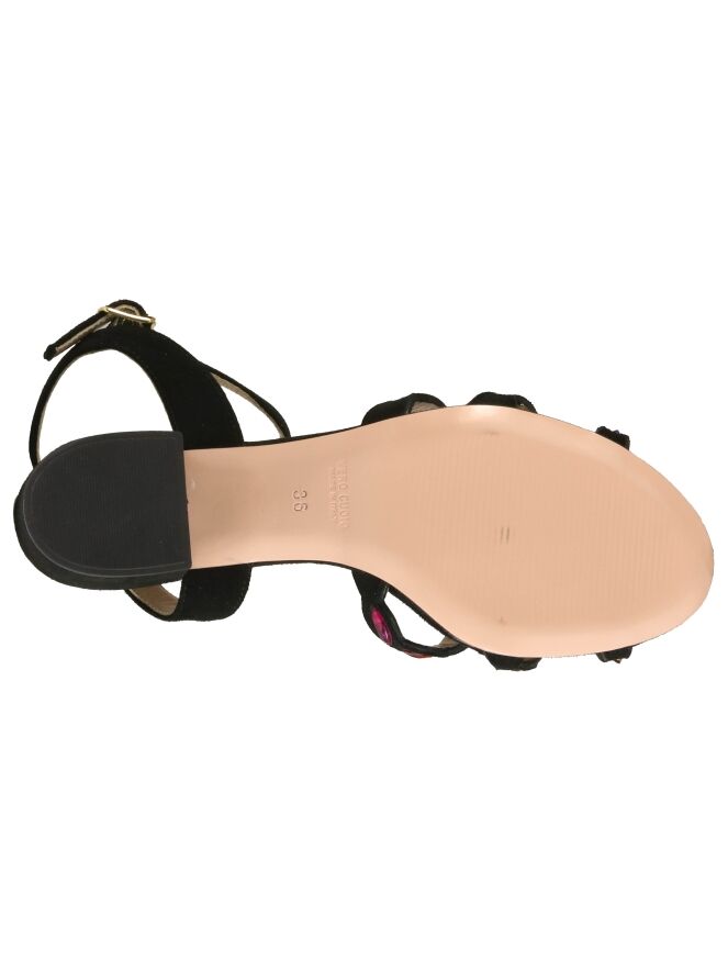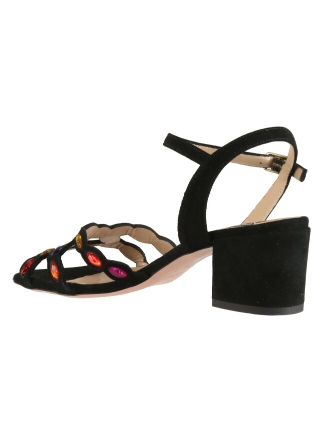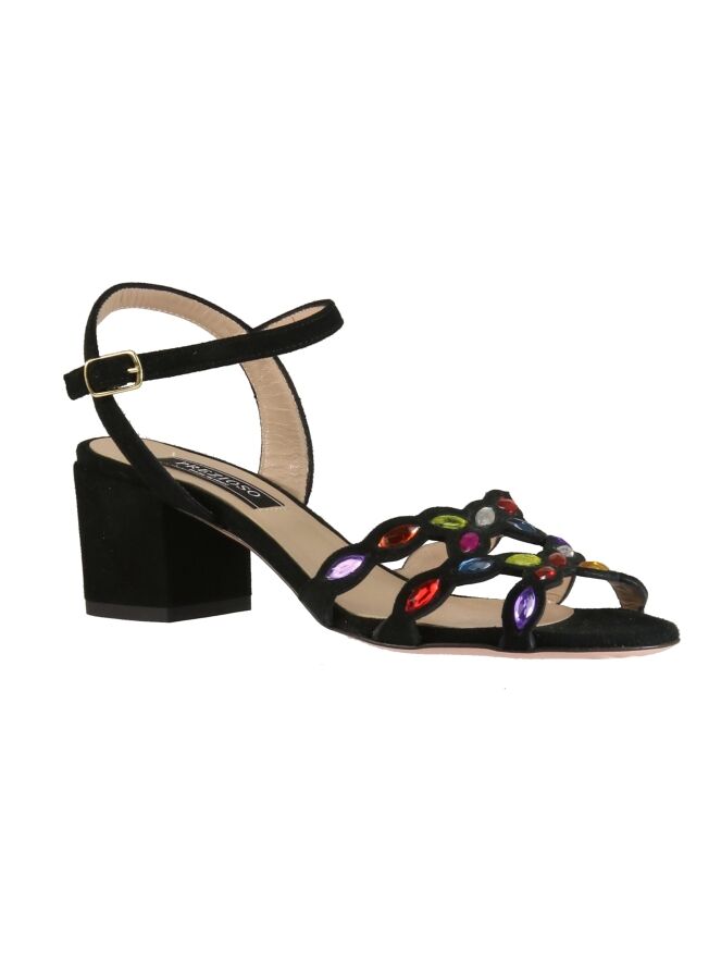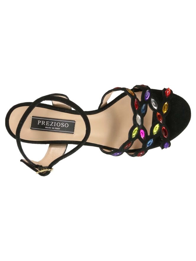 Een open pump van Prezioso in de kleur zwart. Over de voorvoet is het suède uitgesneden en over de diagonale lijnen zijn strassteentjes in frisse kleuren. De elegante blokhak is in het zelfde materiaal als de pump. De pump heeft een hielbandje en een verstelbaar riembandje.