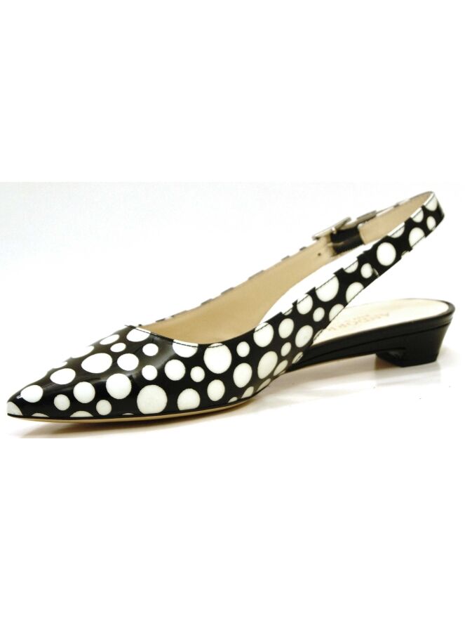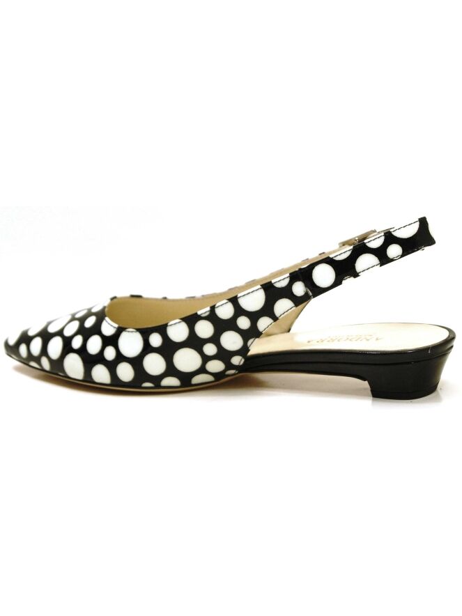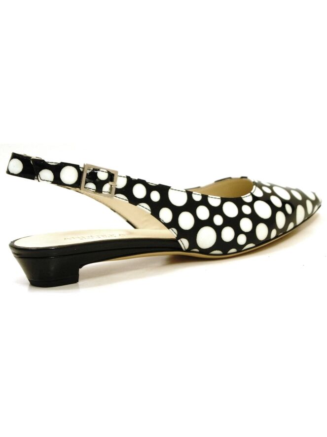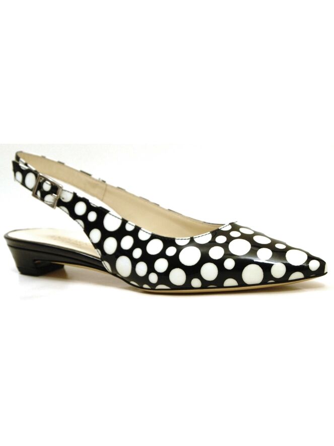Een pump van het merk Prezioso in de kleur zwart en met een open hiel. De pump heeft een ballen print en is in het lakleder uitgevoerd. De hak van de pump is in het marine blauw. De binnenzijde van de schoen is met leder gevoerd.