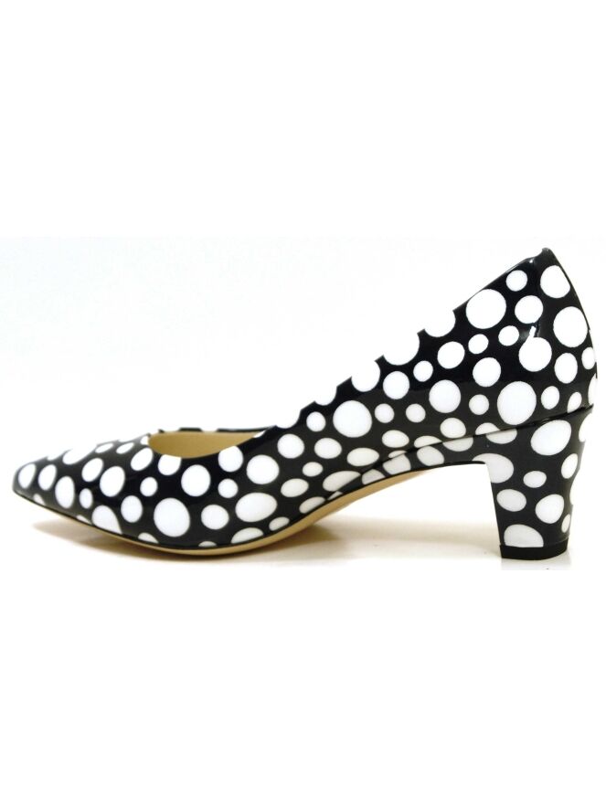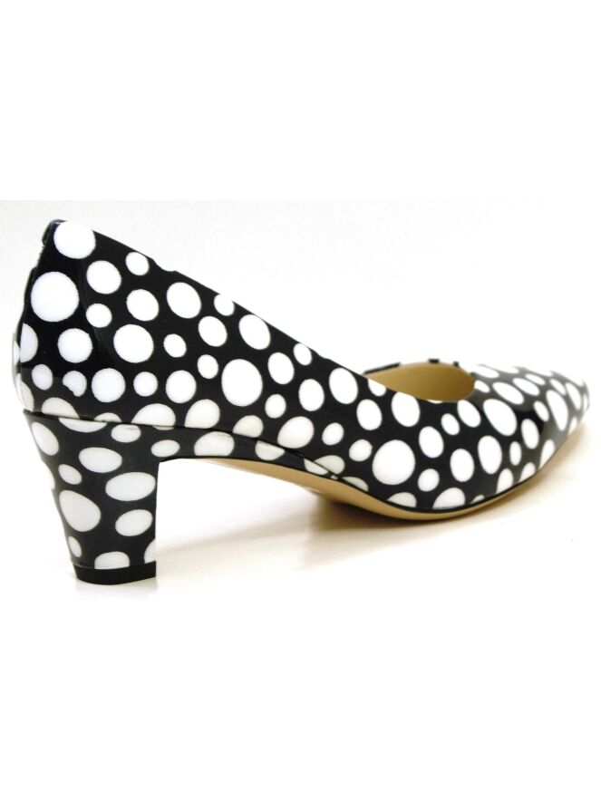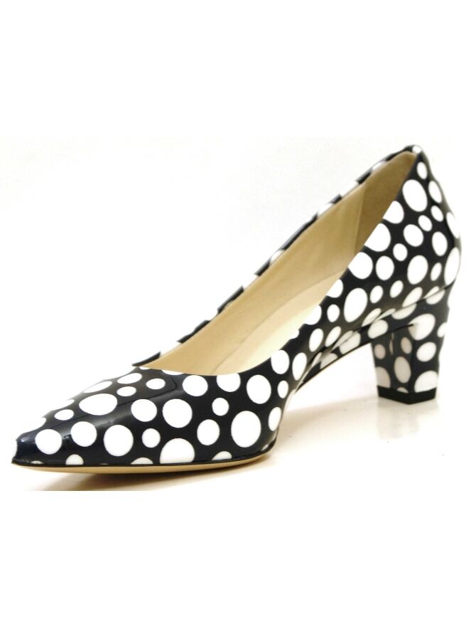 Een pump van het merk Prezioso in de kleur marine blauw. De pump heeft een ballen print en is in het lakleder uitgevoerd. De hak van de pump is in hetzelfde materiaal als de schoen. De binnenzijde van de schoen is met leder gevoerd.