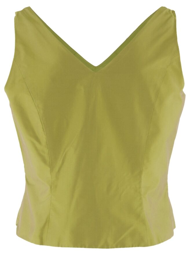 Een top van Renato Nucci in een mat satijnen groene kleur. De top heeft aan de voor en achterkant een V- Hals. Deze top mag niet worden gewassen.