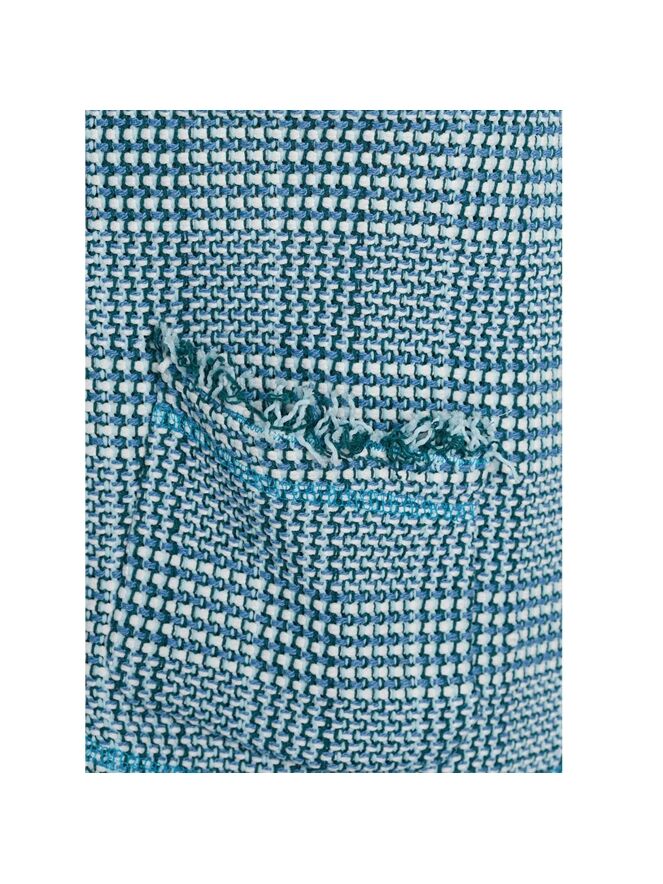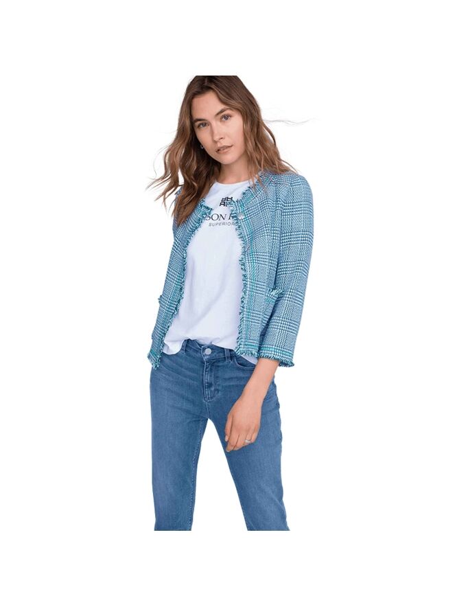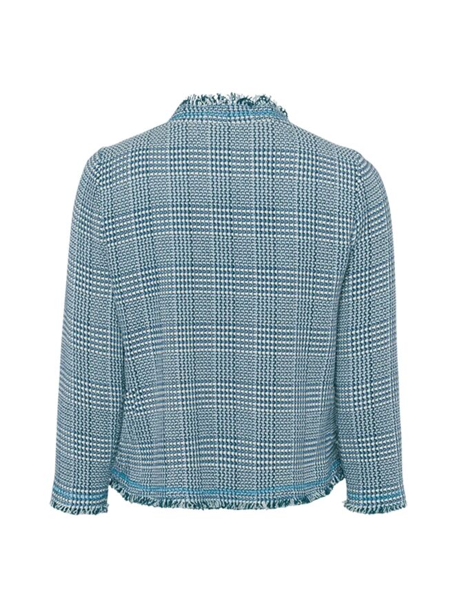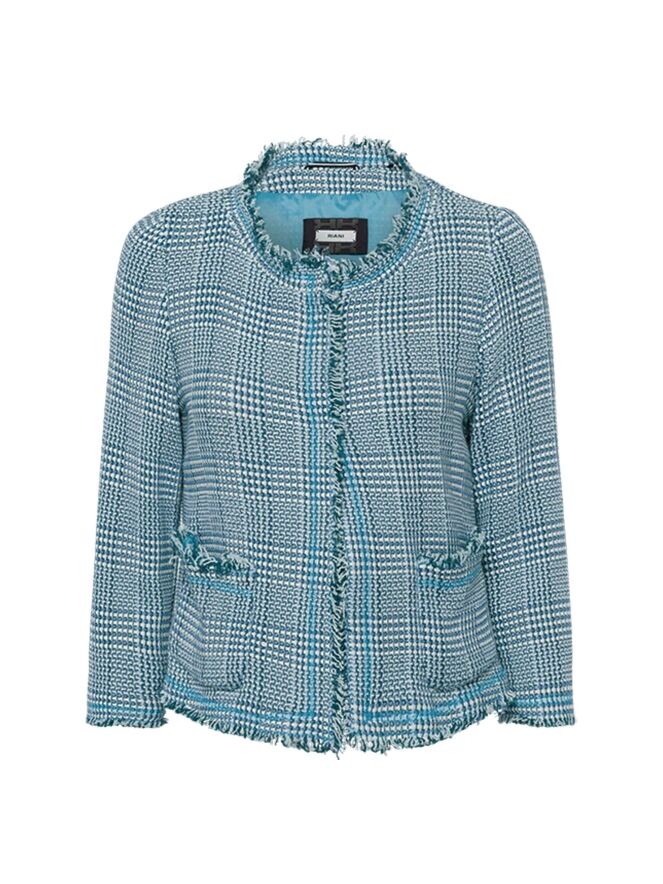 Een chanel blazer van Riani in een ijsblauwe kleur met wit en smaragdgroen. De randen van de blazer zijn fijn gerafeld. Deze blazer is ongevoerd en mag niet worden gewassen.