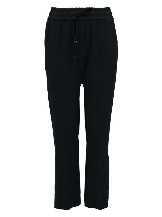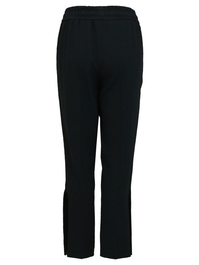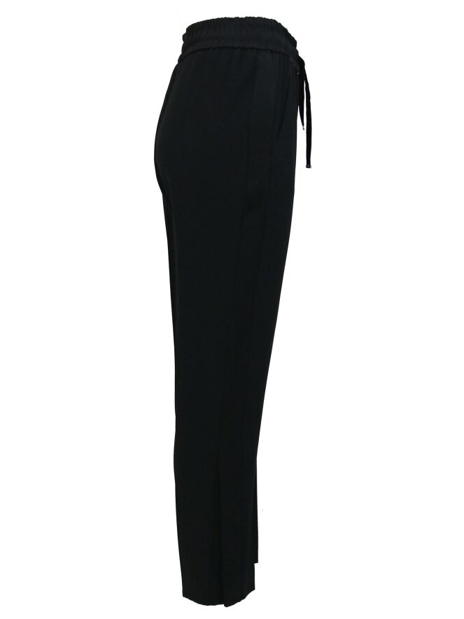 Een broek van Riani in de kleur zwart. In de taille is een elastische mat satijnen en fijn geplooide band. Aan de zijkanten is een brede mat satijnen bies en aan de onderkant is een diepe split in de pijpen. De broek heeft steekzakken en mag niet worden gewassen.