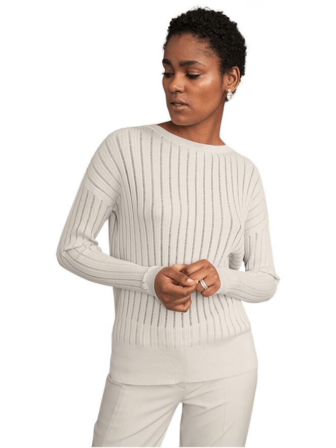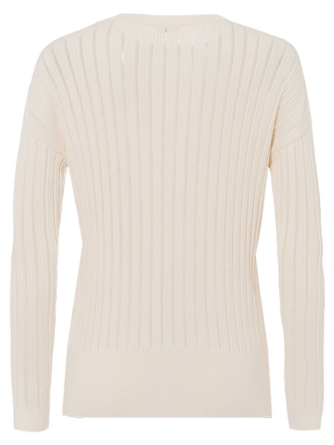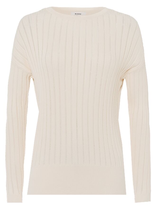 Een luxe pullover van Riani in de kleur beige. De pullover is in een verticale strepen patroon dat deels transparant is. De pullover heeft een ronde hals en lange mouwen. Aan de onderzijde is een brede tricot boord. Deze pullover mag op 30 graden worden gewassen.
