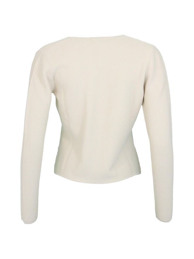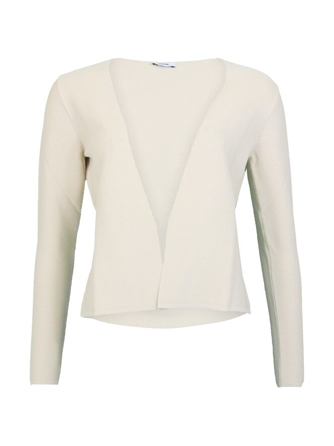 Een kort vest van Riani in de kleur beige. Het vest heeft lange mouwen en geen sluiting. Dit vest mag op 30 graden worden gewassen.