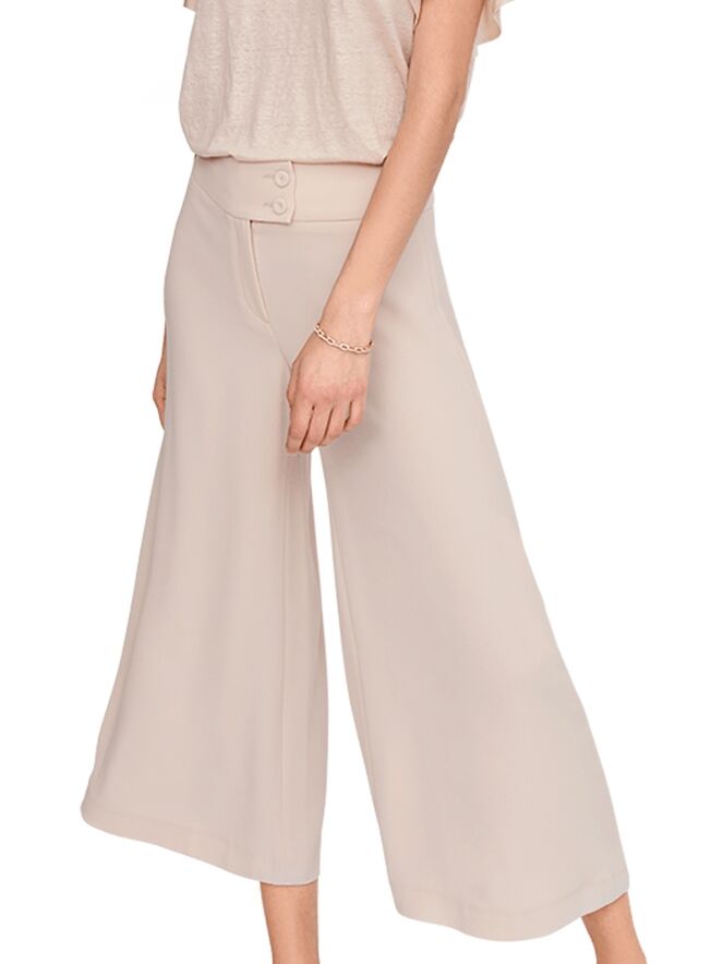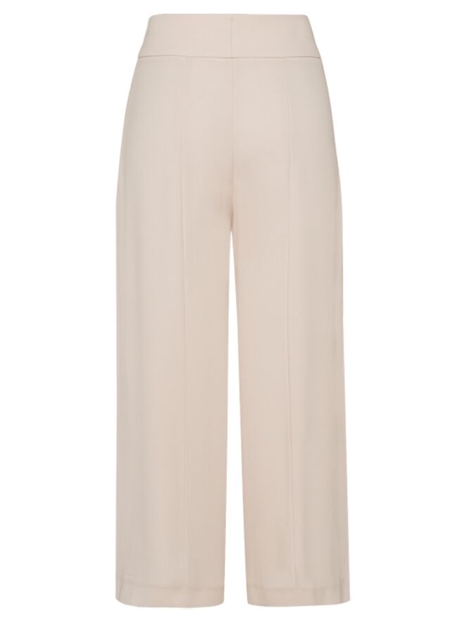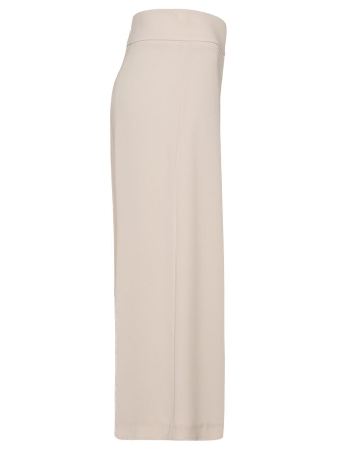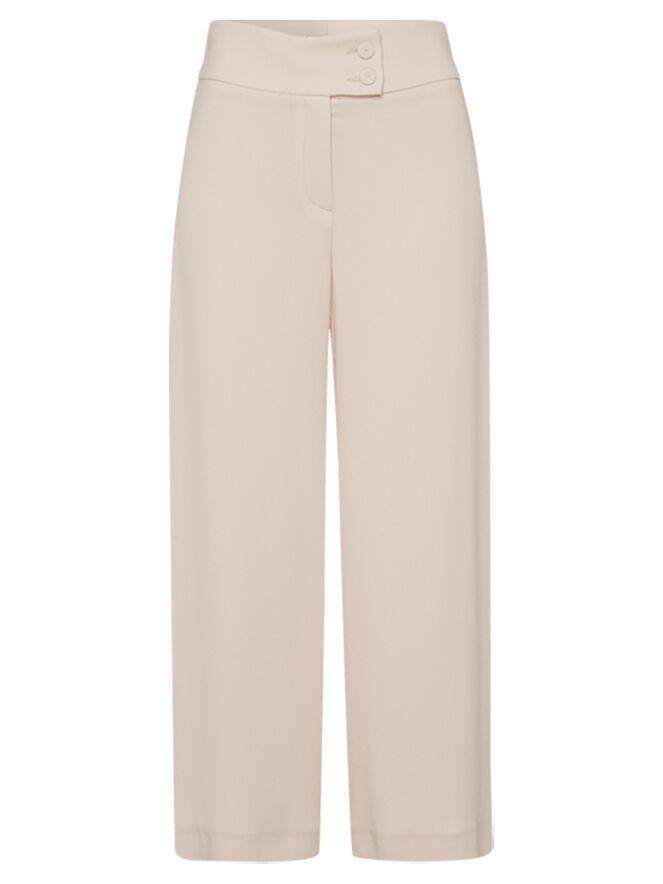 Een zeer wijde broek van Riani in een vanille kleur. In de taille is een brede tailleband met 2 knopen. deze broek mag op 30 graden worden gewassen.
