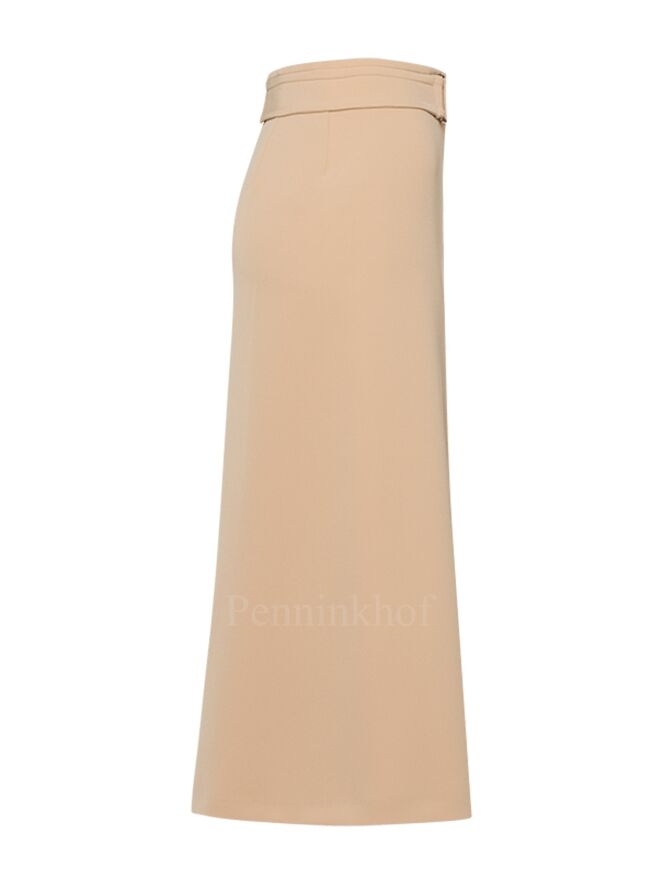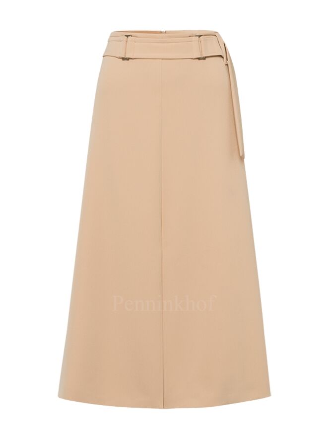 Een rok van Riani in een volle zandkleur. De rok heeft een lichte A - lijn met aan de onderkant in het midden aan de voor en achterzijde een split. In de taille is een brede ceintuur. Deze rok mag niet worden gewassen.
