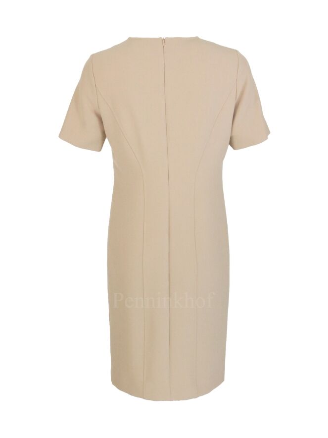Een jurk van Riani in een volle zandkleur. De jurk heeft een V - Hals en heeft korte mouwen. Aan de onderkant is aan de voorzijde, links van het midden een korte split. De jurk is gevoerd en mag niet worden gewassen.