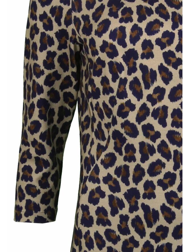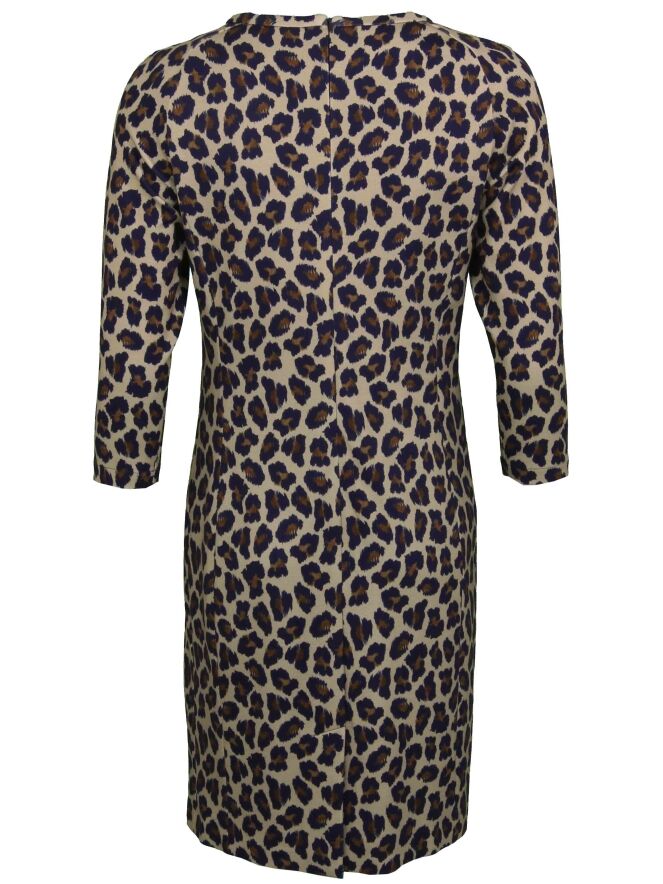 Een jurk van het merk Riani in een panterprint met de kleuren marine blauw, taupe en cognac. De jurk heeft een ronde hals en halflange mouwen. De jurk is gevoerd en mag niet worden gewassen.