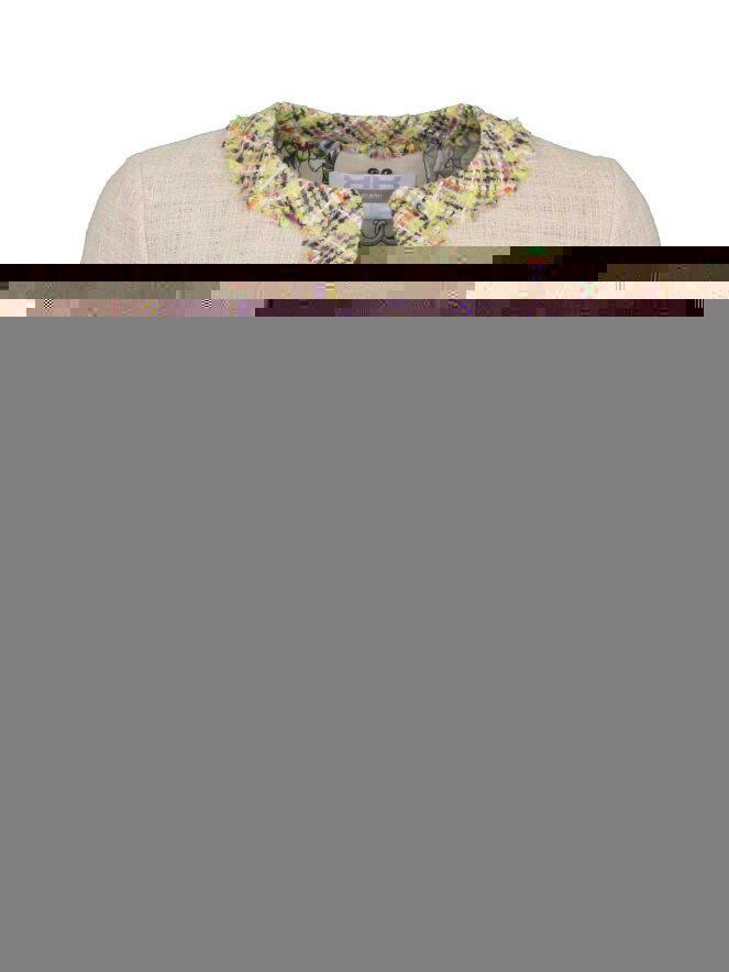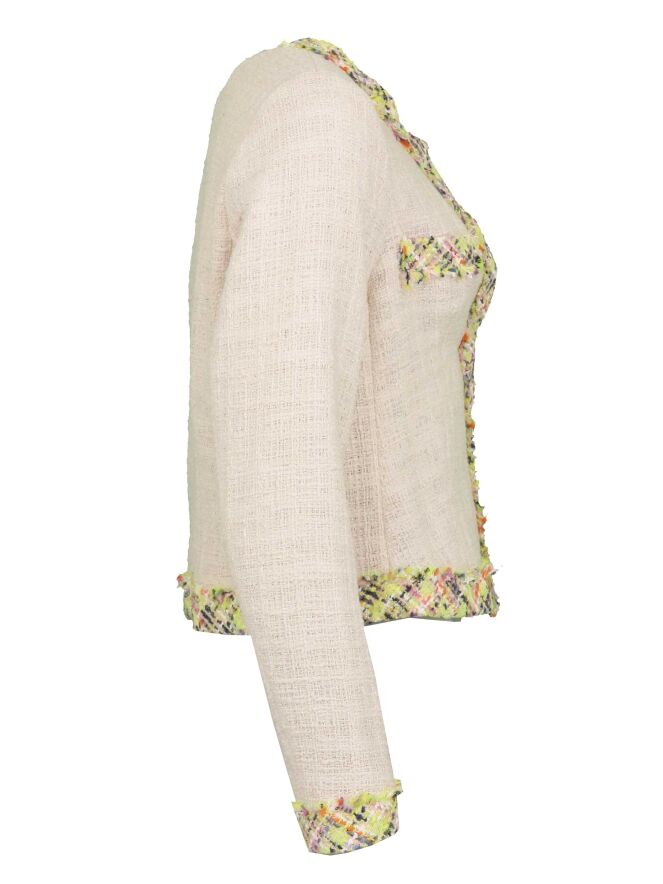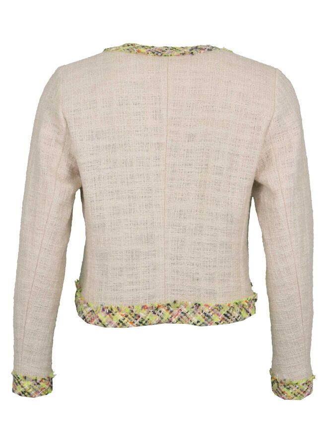 Een korte blazer van Riani in een zand kleur. Langs de randen is een diagonaal geweven stof in meerdere kleuren met fijn gerafelde uiteinden. De blazer heeft als sluiting 3 drukknopen en is ongevoerd. Deze blazer mag niet worden gewassen.