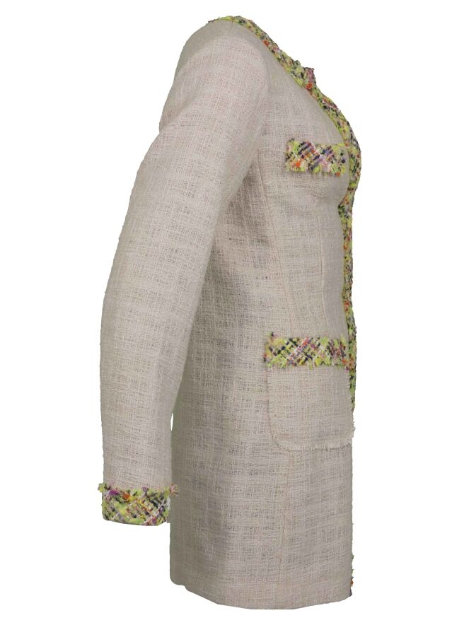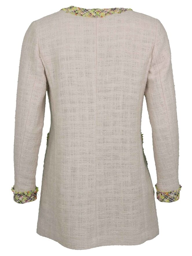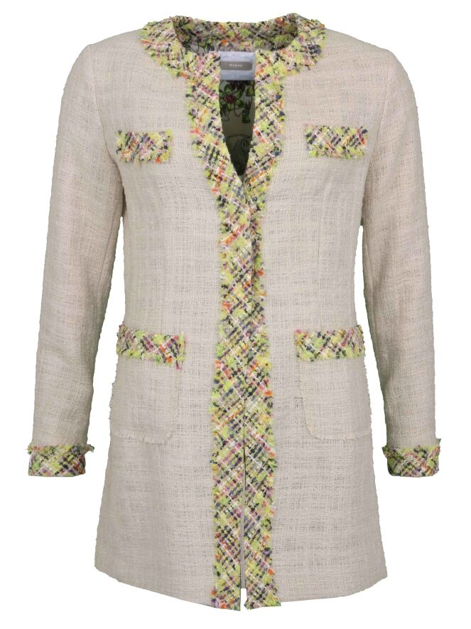 Een lange blazer van Riani in een zand kleur. Langs de randen is een diagonaal geweven stof in meerdere kleuren met fijn gerafelde uiteinden. De blazer heeft als sluiting 2 drukknopen en is ongevoerd. Deze blazer mag niet worden gewassen.