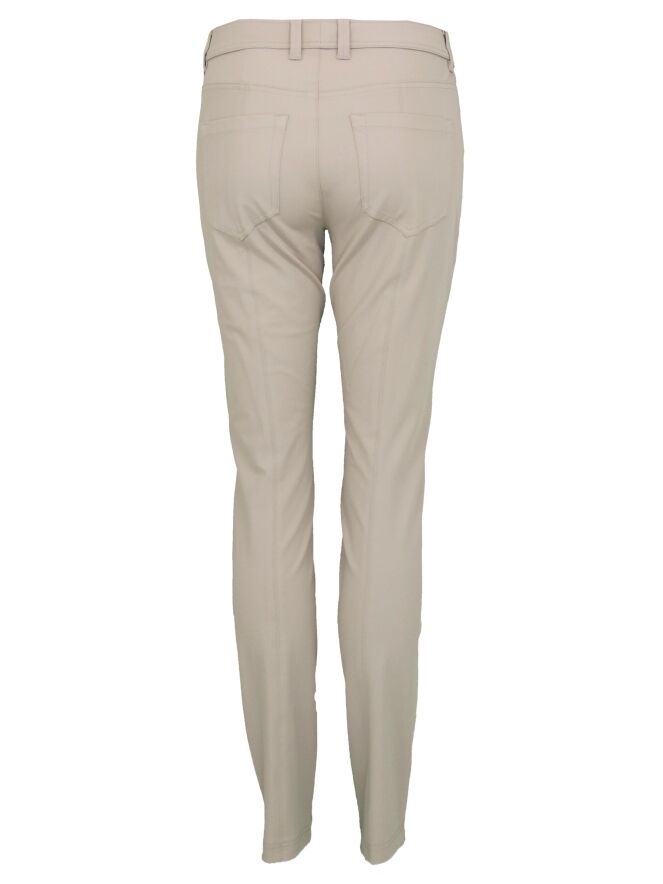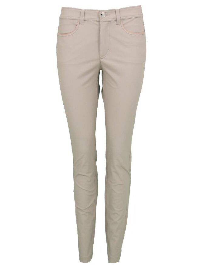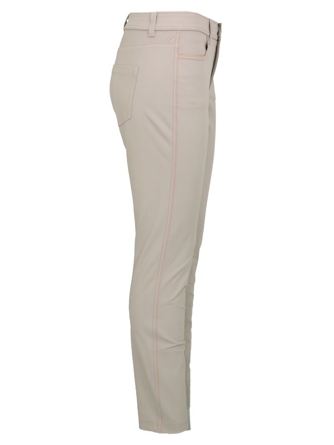 Een broek van Riani in een pastel khaky kleur. De stiknaden van de broek zijn in oranje. De zakken hebben een rond lopende rand en deze broek mag op 30 graden worden gewassen.
