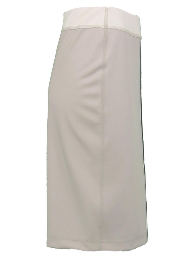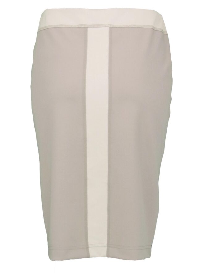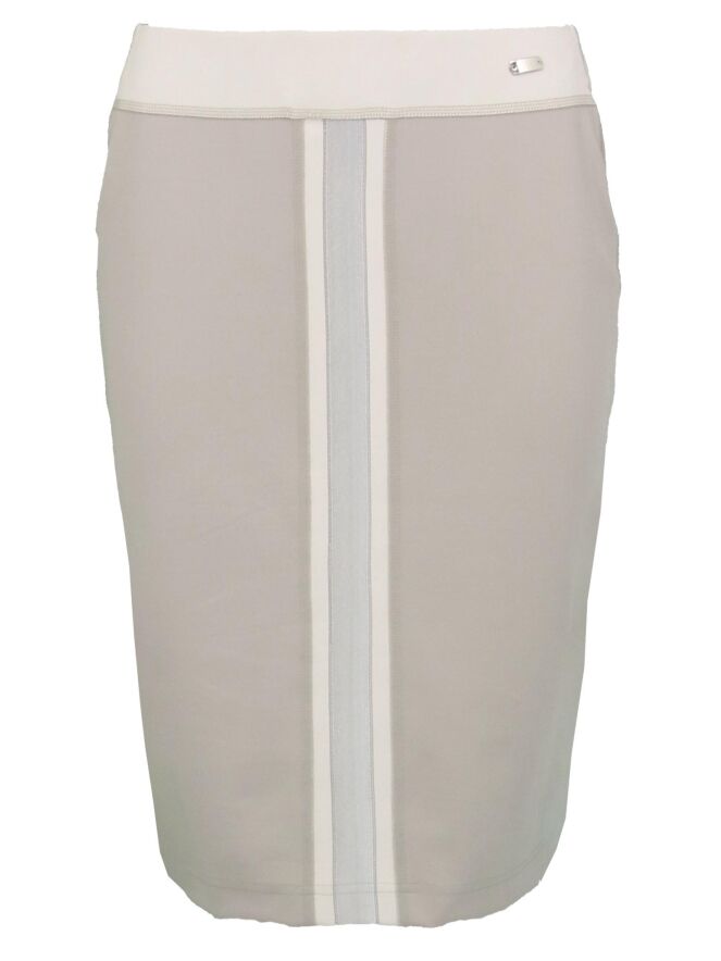 Een rok van Riani in een pastel khaky kleur met zand. In de taille is en 4 cm brede elastieken band. In het midden van de voor en achterzijde is een brede bies. Aan de voorzijde is deze in een metallic stof. De rok is gevoerd en valt net boven de knie. Deze rok mag op 30 graden worden gewassen.