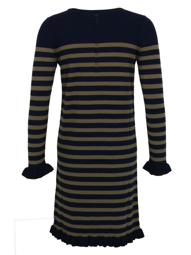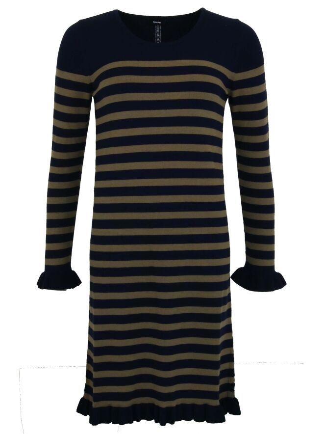 Een jurk van Riani in een strepen patroon met de kleuren marine blauw en khaki. Aan de uiteinden van de lange mouwen en aan de onderkant van de jurk is een geplooide boord. Deze jurk mag op de hand worden gewassen.
