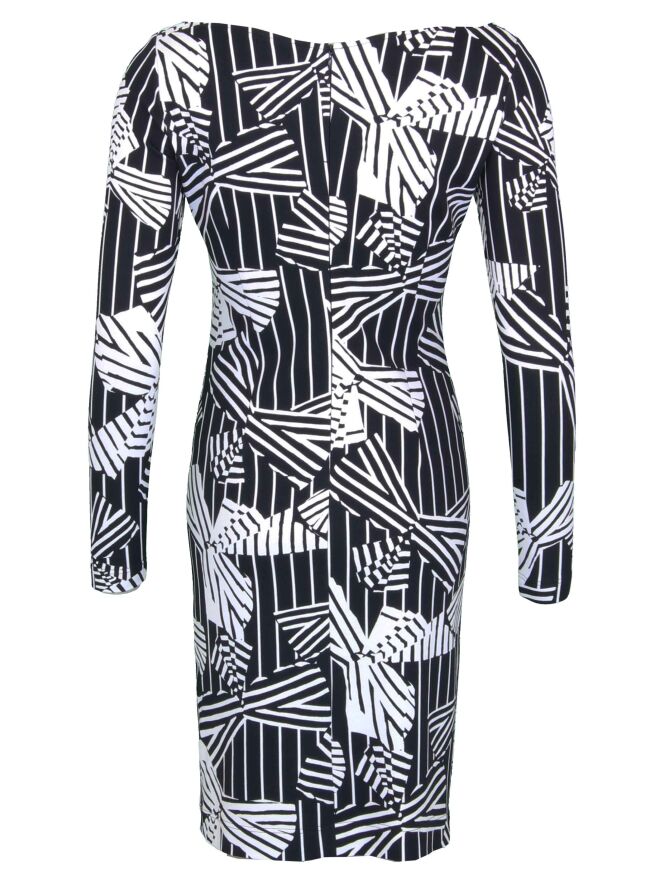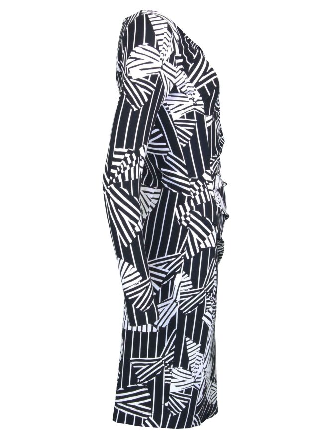 Een jurk van Riani in een grafische print van strikken in de kleuren marine blauw met wit. Aan de rechter zijkant zijn ter hoogte van de taille meerdere plooien wat een drapeer effect geeft. De jurk heef een rond lopende V - Hals en mag niet worden gewassen.