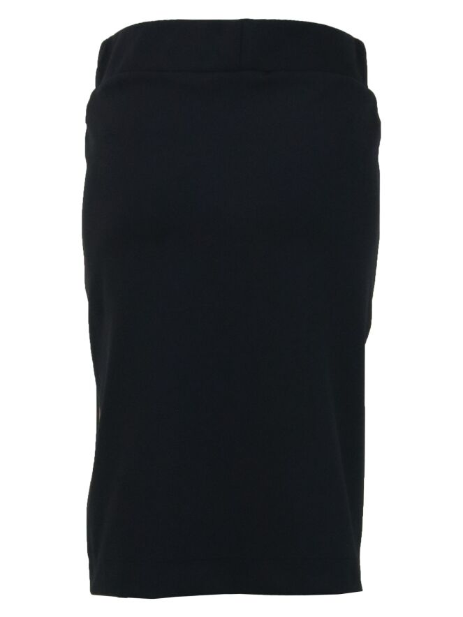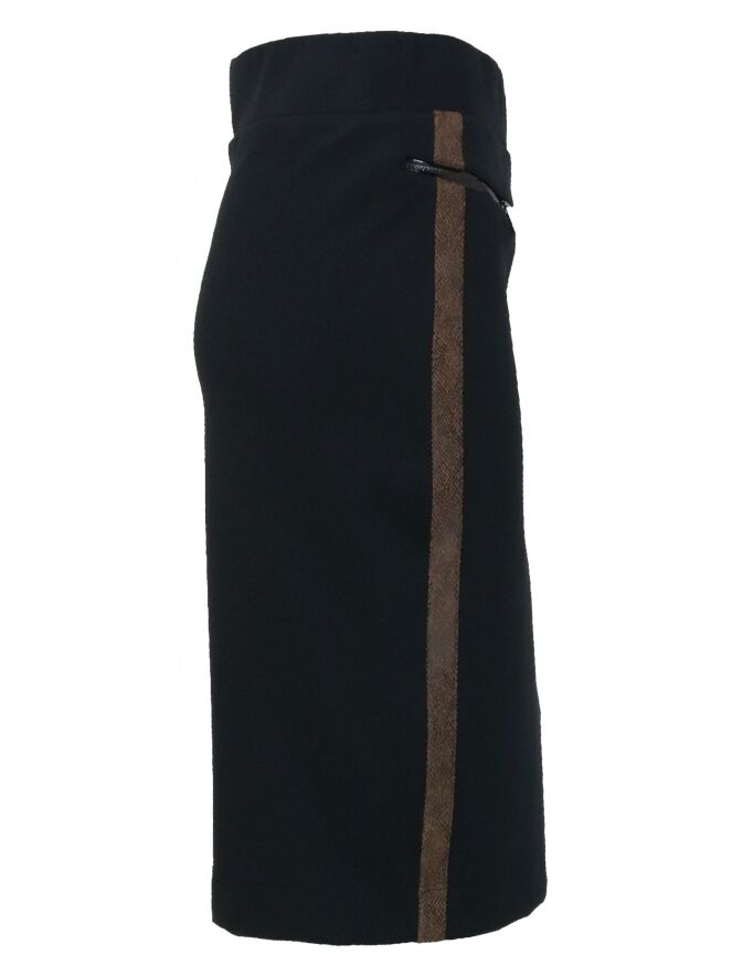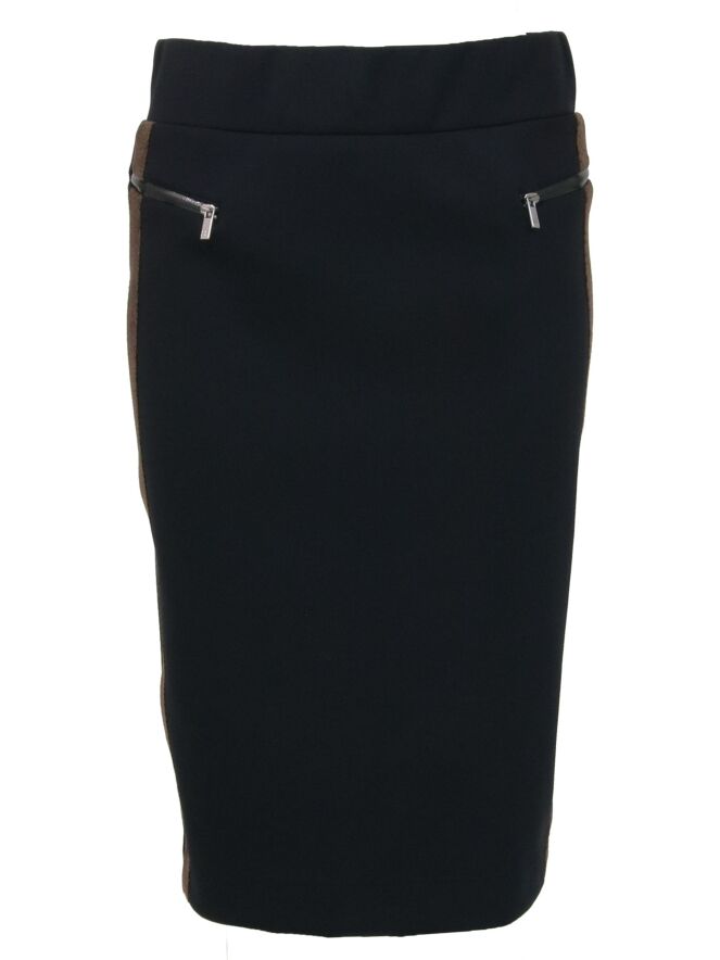 Een rok van Riani in de kleur zwart. In de taille is een brede elastische band. Aan de voorzijde zijn 2 ritsjes met een lak bies in de kleur zwart. Aan de zijkanten is een bies in een bruine reptielprint. De rok is ongevoerd en mag op de hand worden gewassen.