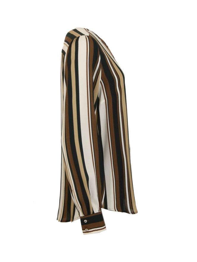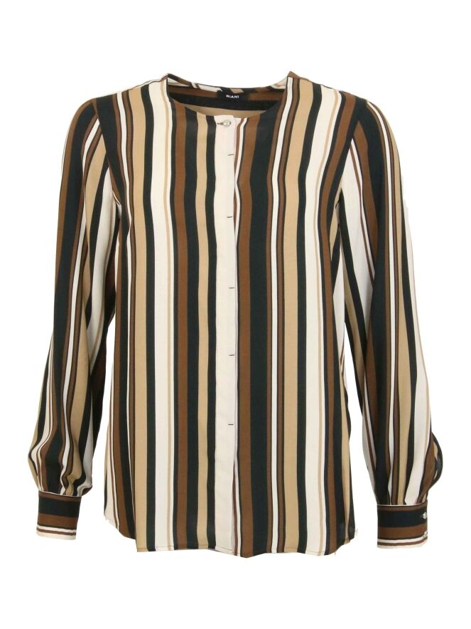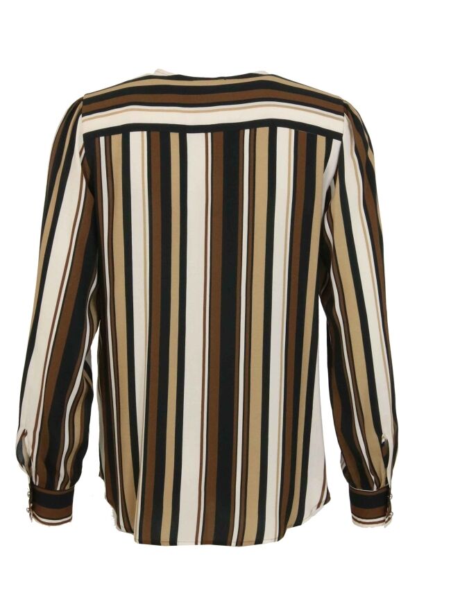 Een blouse van Riani in een strepen print met de kleuren camel, zwart, bruin en vanille. Deze blouse mag op 30 gaden worden gewassen.