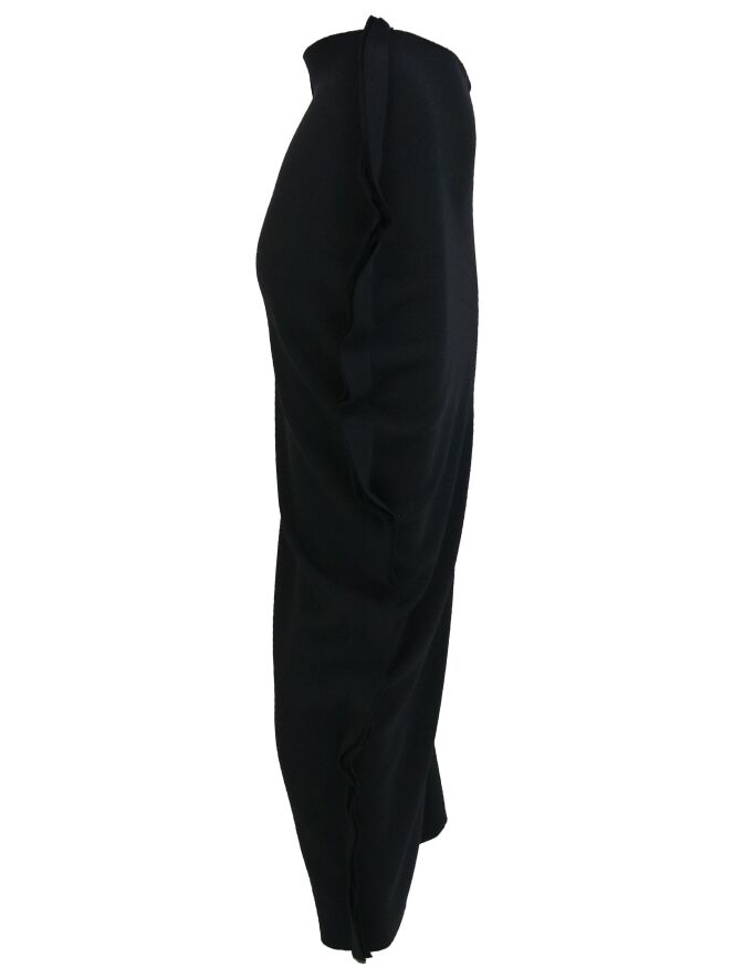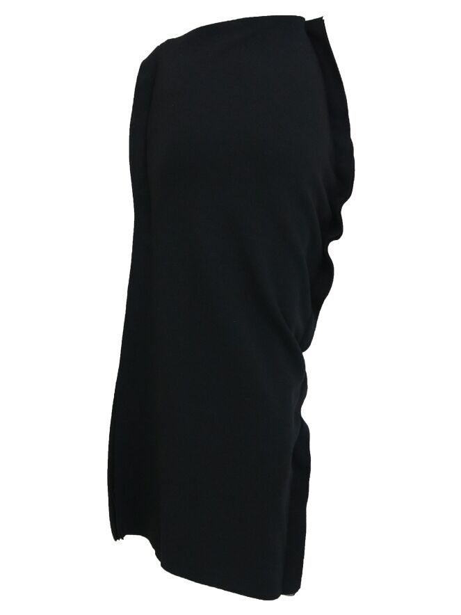 Een rok van Rundholz in de kleur zwart. Aan de zijkante n is de stof omgedraaid gestikt. De rok kan aan één zijd iets worden opgetrokken waardoor er een mooi plooi effect ontstaat. Deze rok mag niet worden gewassen.