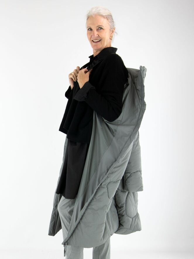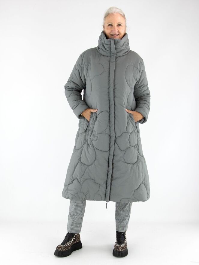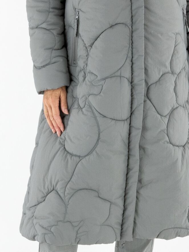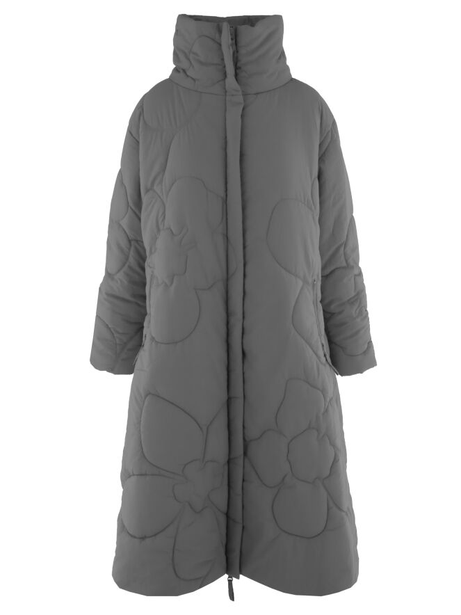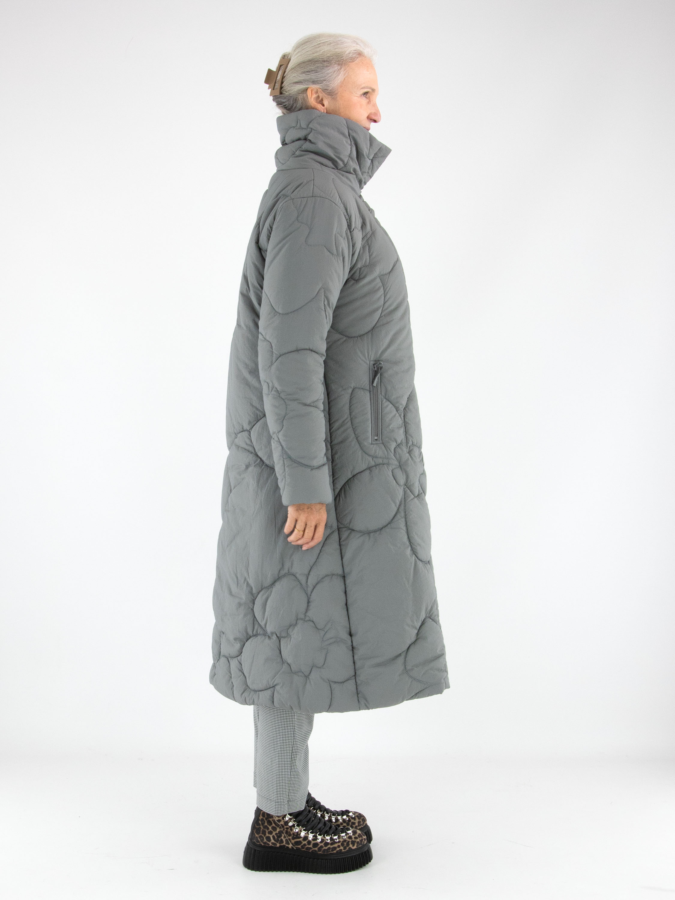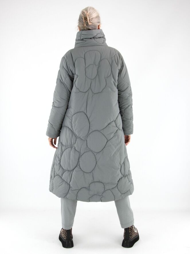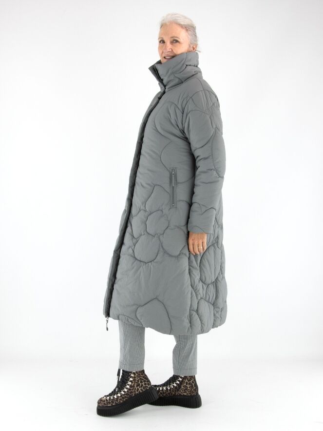 Een lange coat van Rundholz Black Label in de kleur grijs. De coat is doorgestikt in een bloemenpatroon. De steekzakken zijn voorzien van een ritssluiting en ook de sluiting van de coat is in grijs uitgevoerd. Deze coat kan op 30 graden worden gewassen.