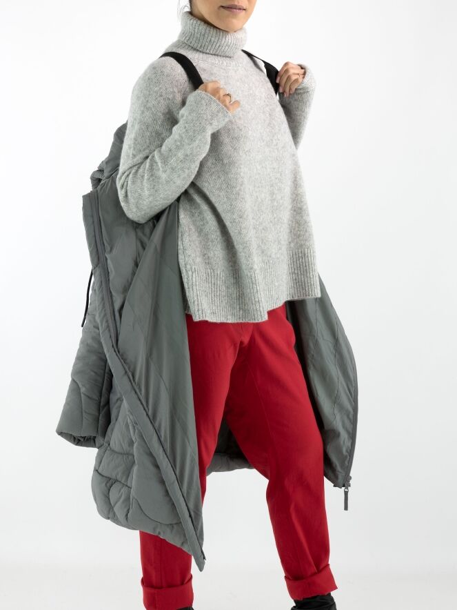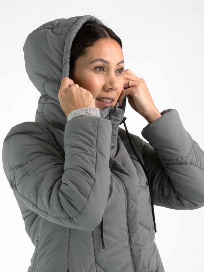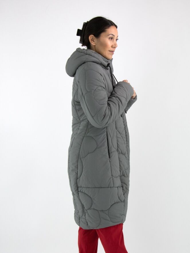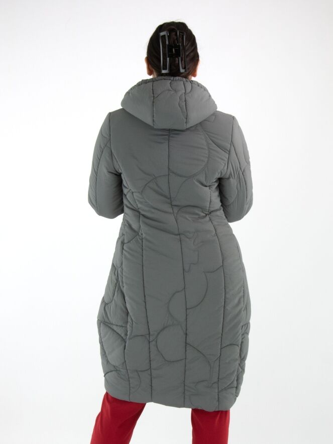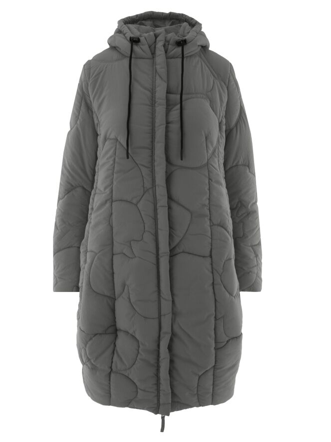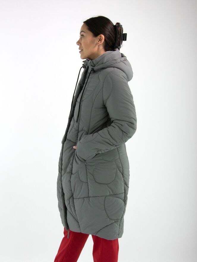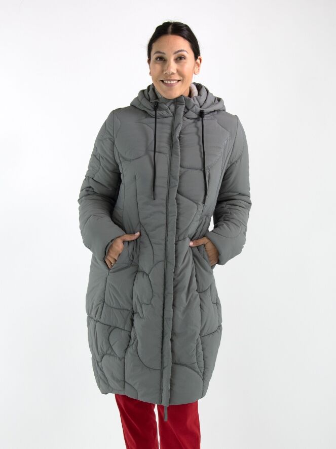 Een halflange, licht getailleerde coat van Rundholz Black Label in de kleur grijs. De coat is doorgestikt in een bloemmotief. Langs de rand van de capuchon loopt een koord in tunnelverwerking waarmee de capuchon kan worden aangetrokken. De steekzakken zijn voorzien van een ritssluiting en ook de sluiting van de coat is in grijs uitgevoerd. Deze coat kan op 30 graden worden gewassen.