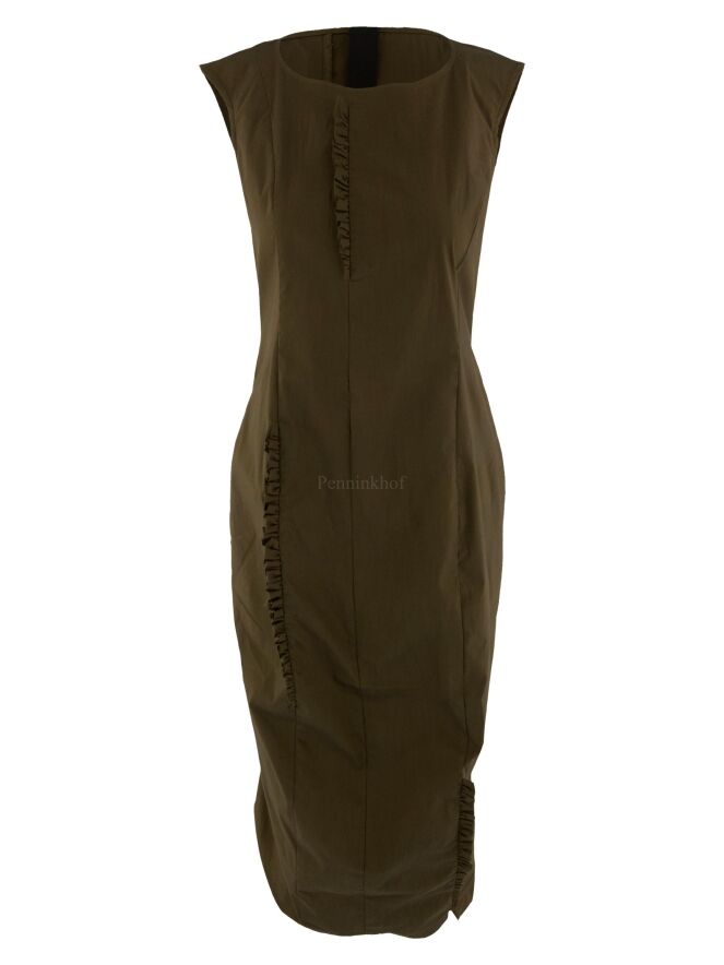 Een jurk van Rundholz black label in de kleur olijfgroen. Op meerdere plaatsen zijn langs de stiknaden aan de voor en achterkant gesmokte biezen.De jurk loopt taps toe en is ongevoerd. Deze jurk mag op 30 graden worden gewassen.