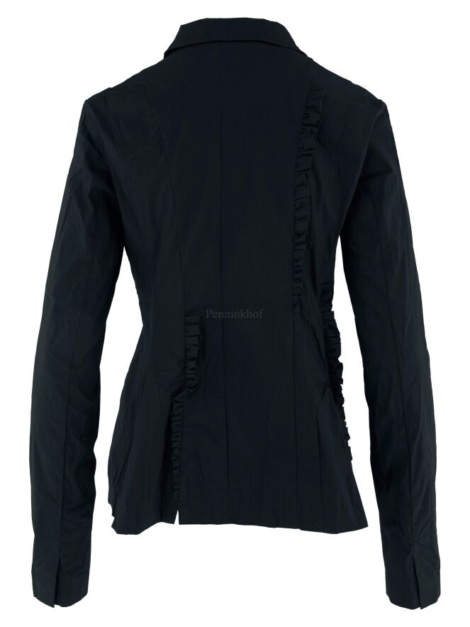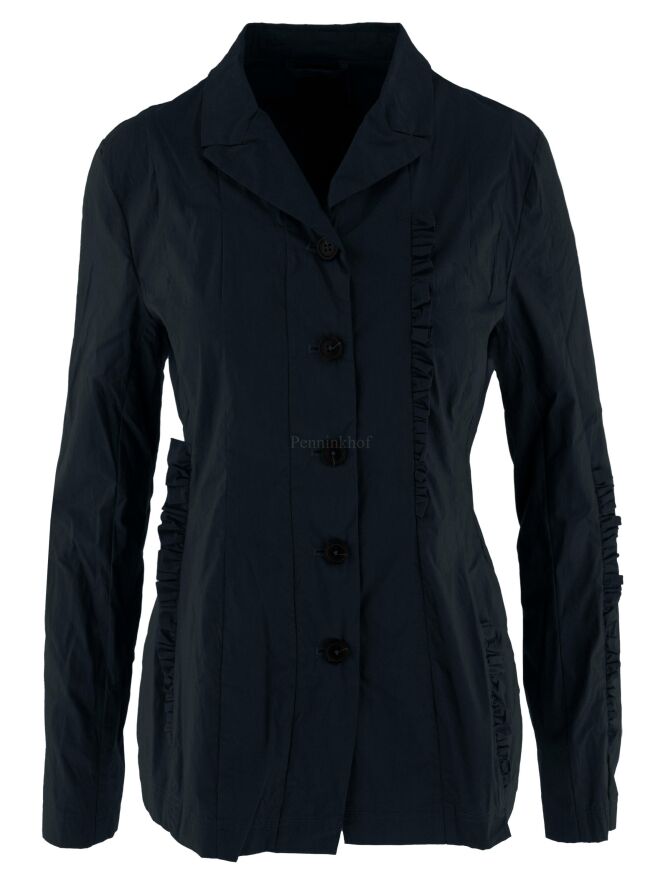 Een blazer van Rundholz black label in de kleur petrolblauw. Op meerdere plaatsen zijn langs de stiknaden aan de voor en achterkant gesmokte biezen.Ter hoogte van de taille zijn steekzakken en de blazer is ongevoerd. Deze blazer mag op 30 graden worden gewassen.