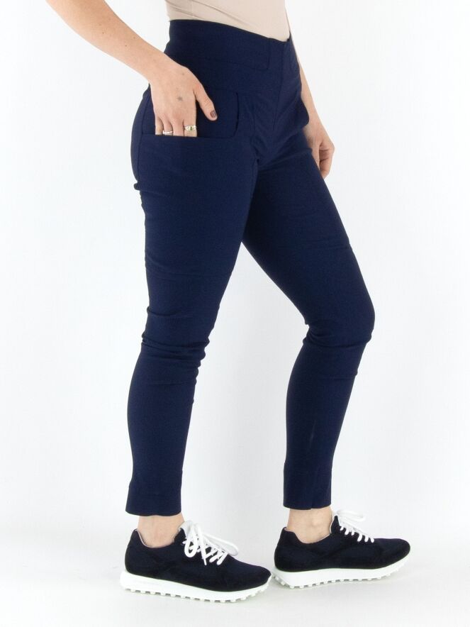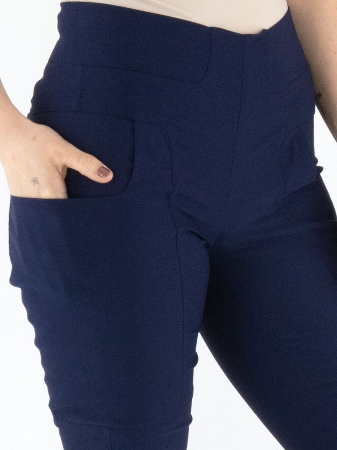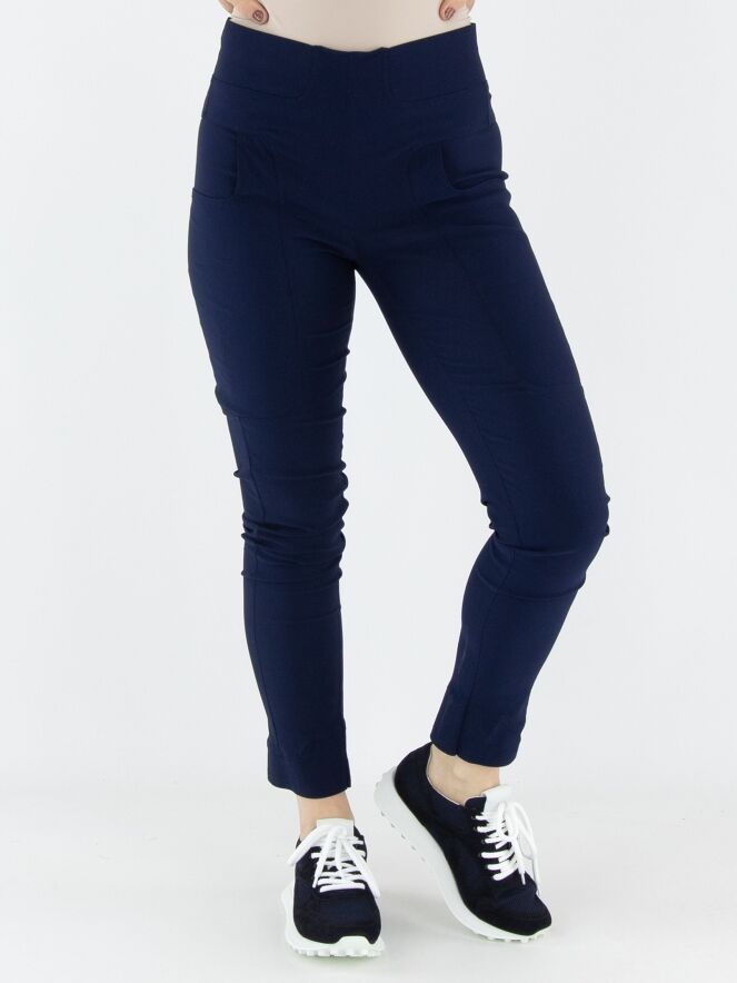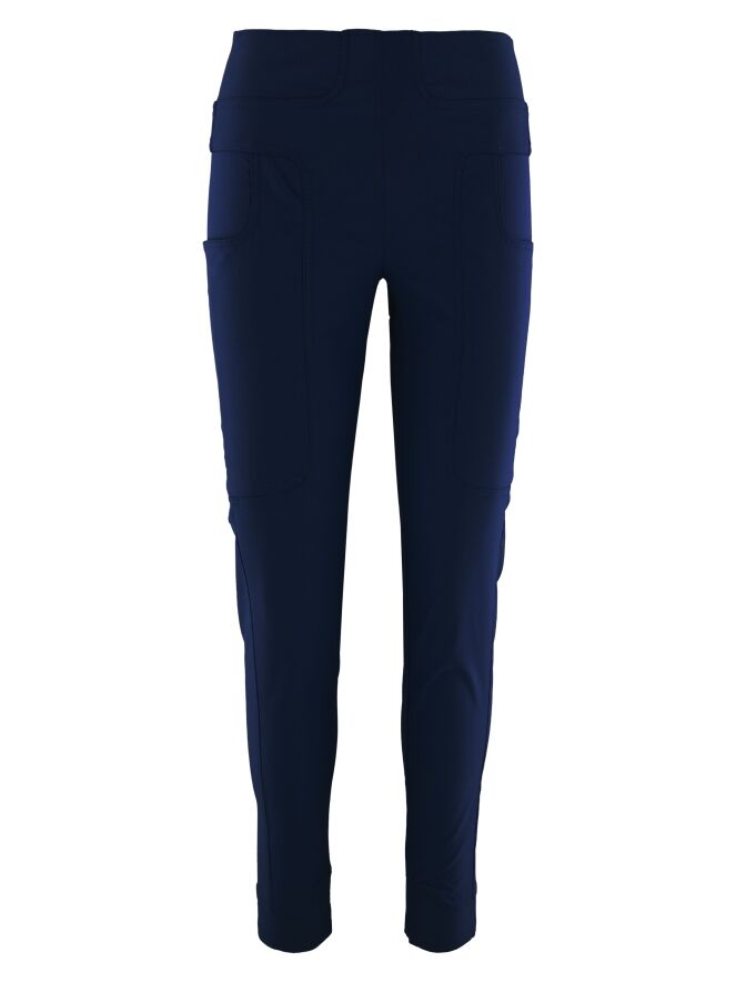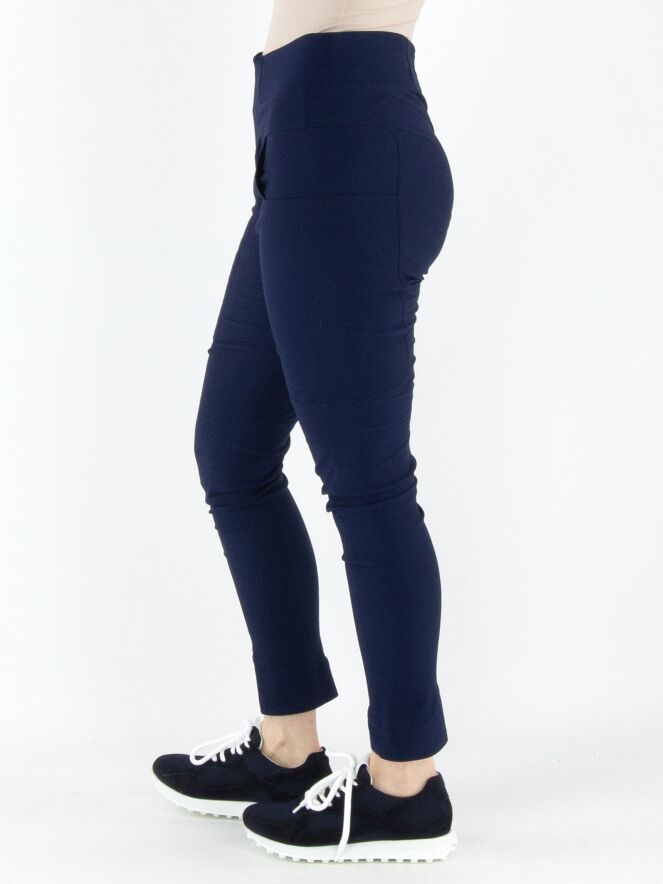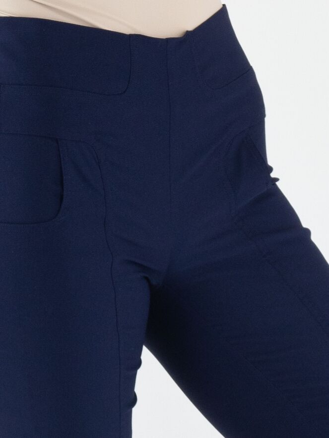 Een broek van Rundholz Black Label in de kleur nachtblauw. In de taille bevindt zich een brede elastische tailleband. Onder de taille zijn verlaagde diepe steekzakken met een rond gesneden rand. Ongeveer 8 cm van de onderkant is een dubbele stiknaad verwerkt. Deze broek kan op 30 graden worden gewassen.