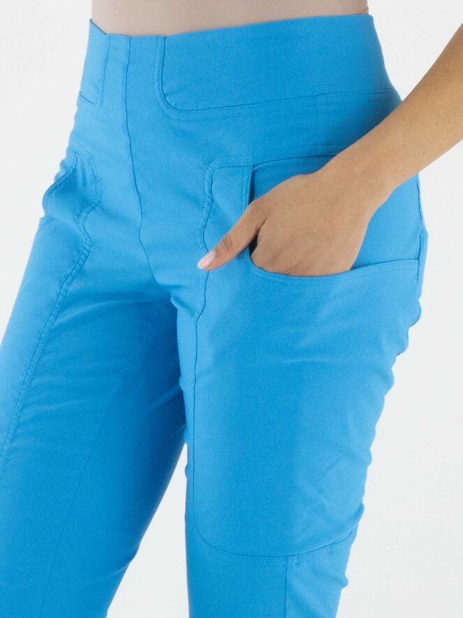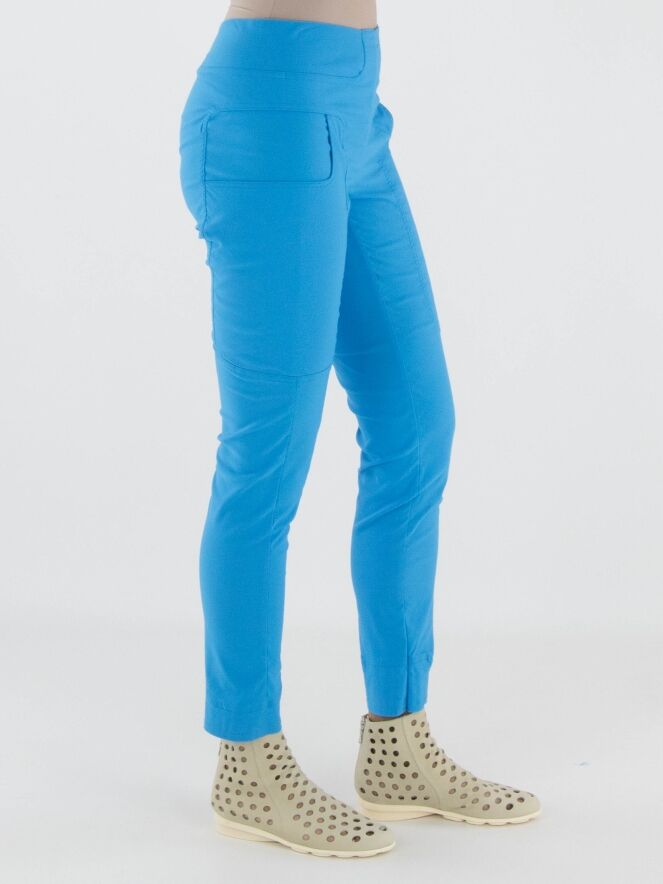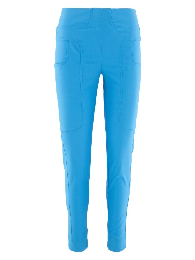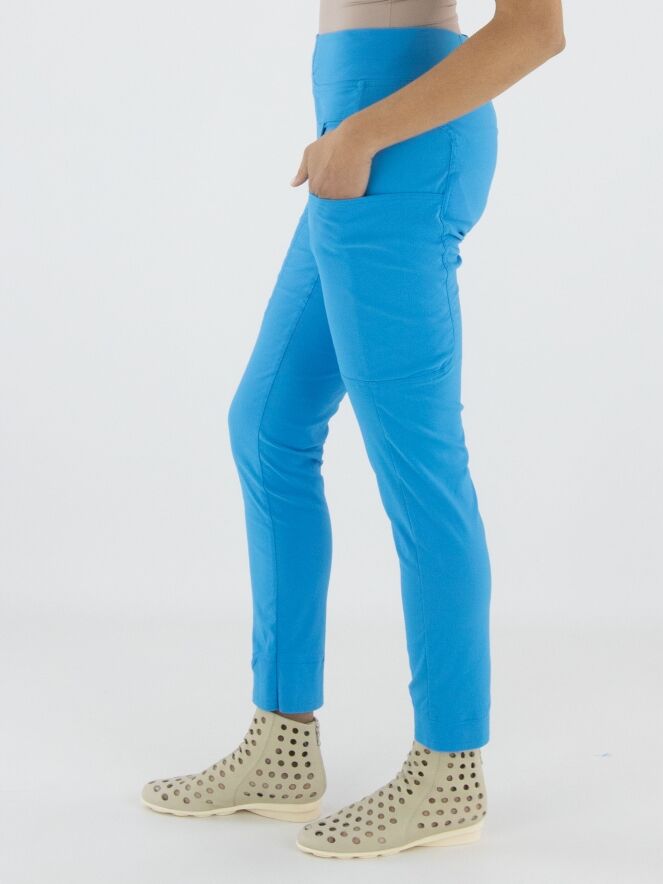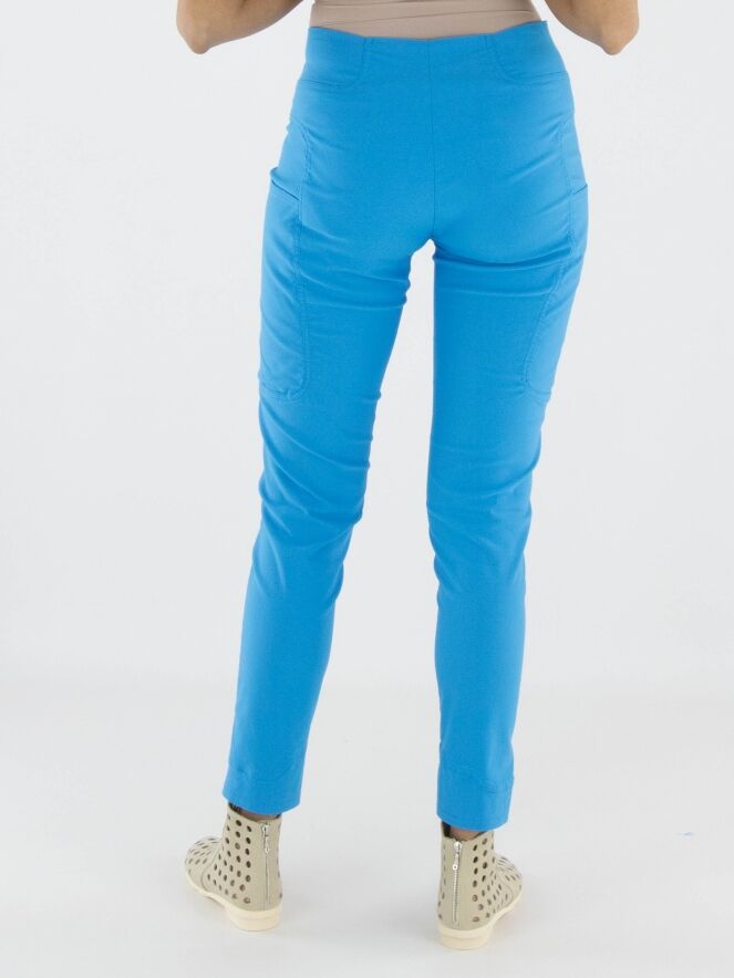 Een broek van Rundholz Black Label in de kleur helderblauw. In de taille bevindt zich een brede elastische tailleband. Onder de taille zijn verlaagde, diepe steekzakken met een rond gesneden rand. Ongeveer 8 cm boven de onderkant van de pijpen is een dubbele stiknaad verwerkt. Deze broek kan op 30 graden worden gewassen.