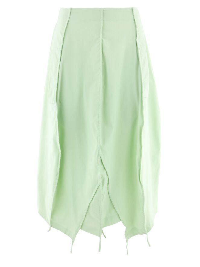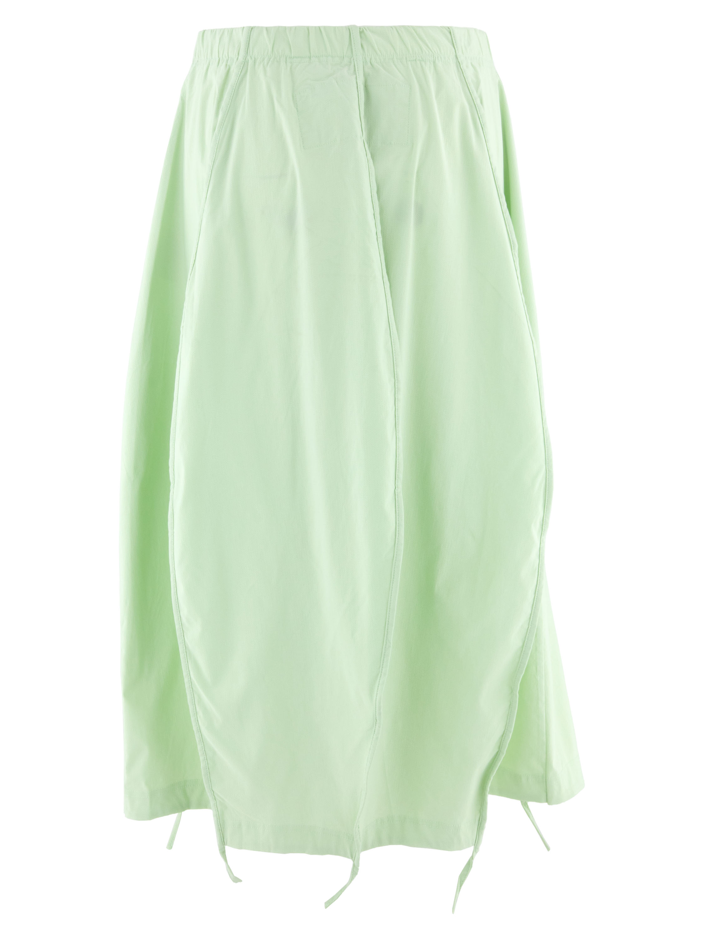 Rok van Rundholz Black Label in een frisse pistachegroene tint. In de taille is een fijn geplooide elastische band verwerkt, wat zorgt voor een comfortabele en vrouwelijke pasvorm. De rok loopt naar beneden uit in een lichte ballonvorm. Aan zowel de voor- als achterzijde zijn drie omgekeerde stiknaden met bies aangebracht, waarvan één deels onder de zoom doorloopt als een kort lint voor een speels detail. Onder de tailleband zijn steekzakken verwerkt. De rok is ongevoerd en kan op 30 graden worden gewassen.