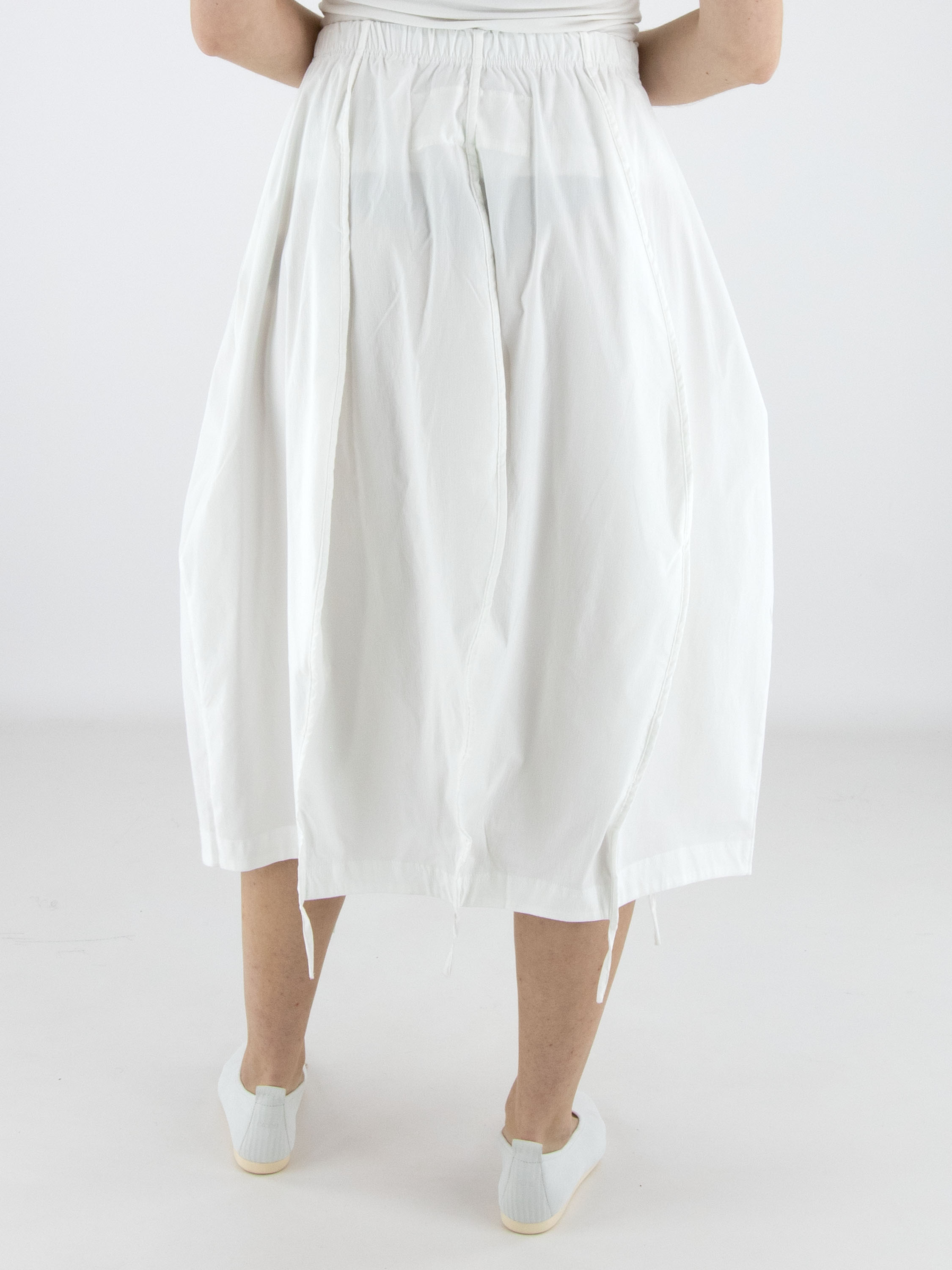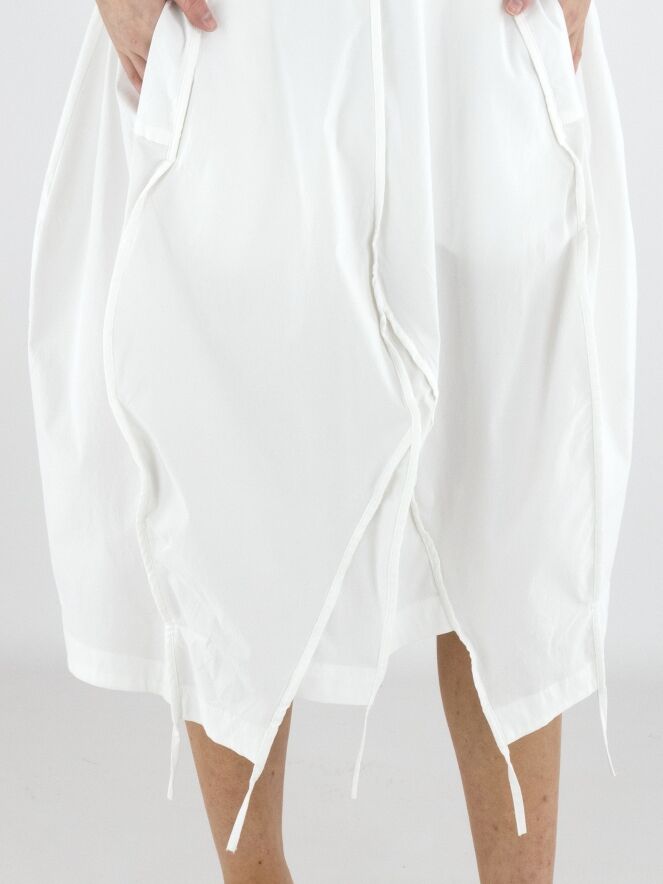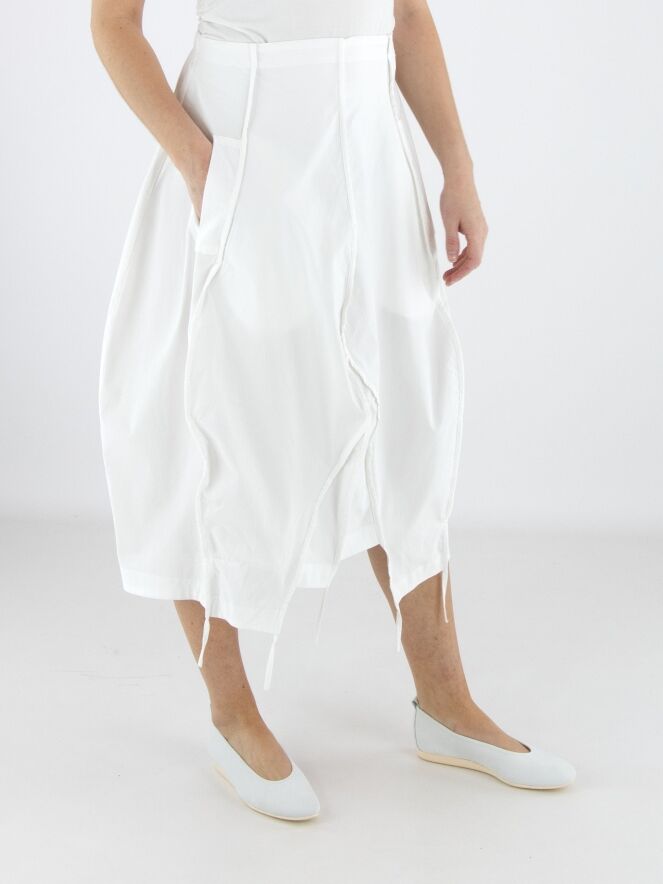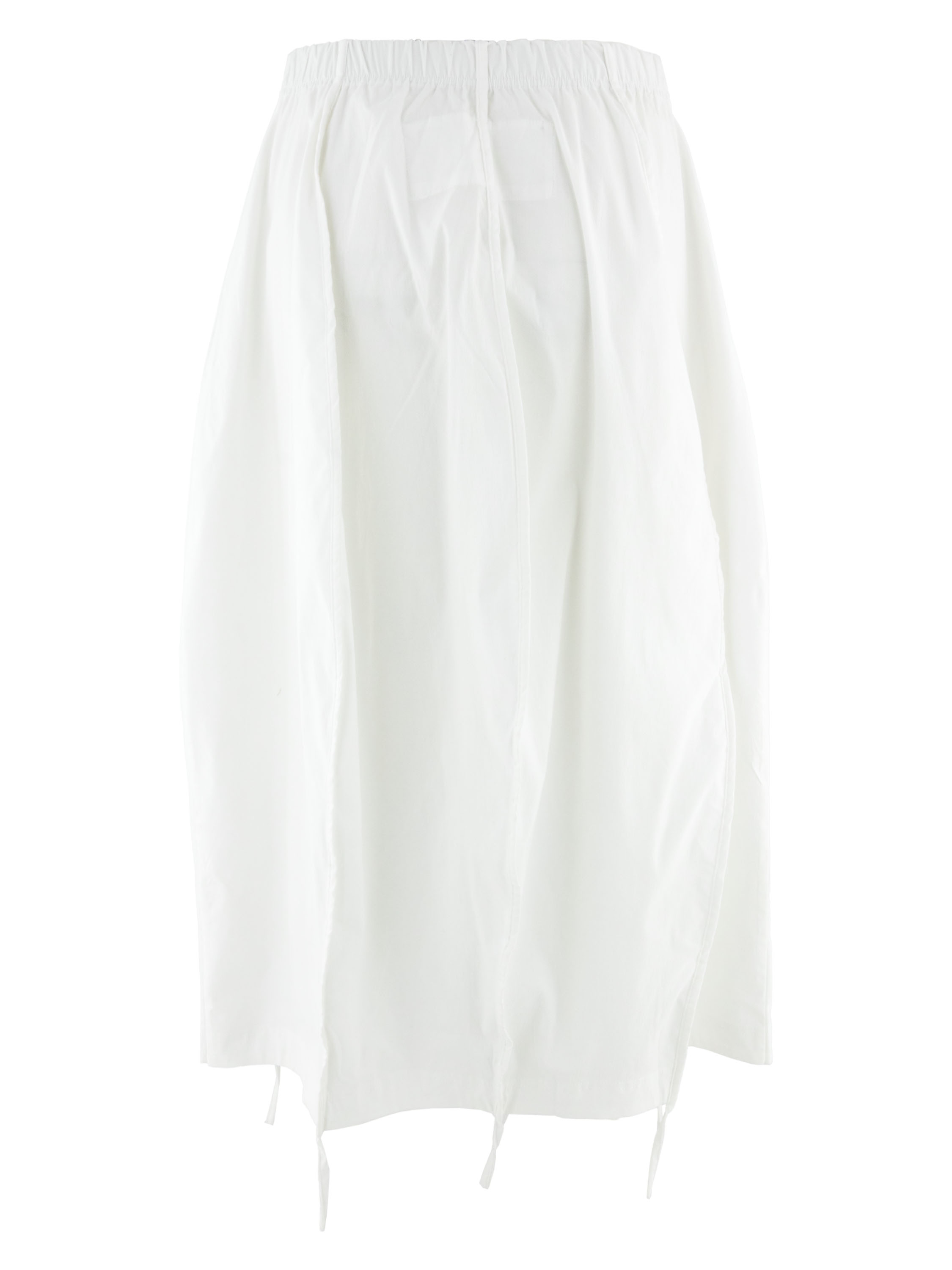 Rok van Rundholz Black Label in de kleur roomwit. In de taille is een fijn geplooide elastische band verwerkt, wat zorgt voor comfort en een soepele pasvorm. De rok loopt naar beneden toe uit in een lichte ballonvorm. Aan zowel de voor- als achterzijde zijn drie omgekeerde stiknaden met een bies aangebracht, waarvan een kort gedeelte onder de zoom zichtbaar is als een subtiel lintdetail. Direct onder de tailleband zijn steekzakken verwerkt. De rok is ongevoerd en kan op 30 graden worden gewassen.