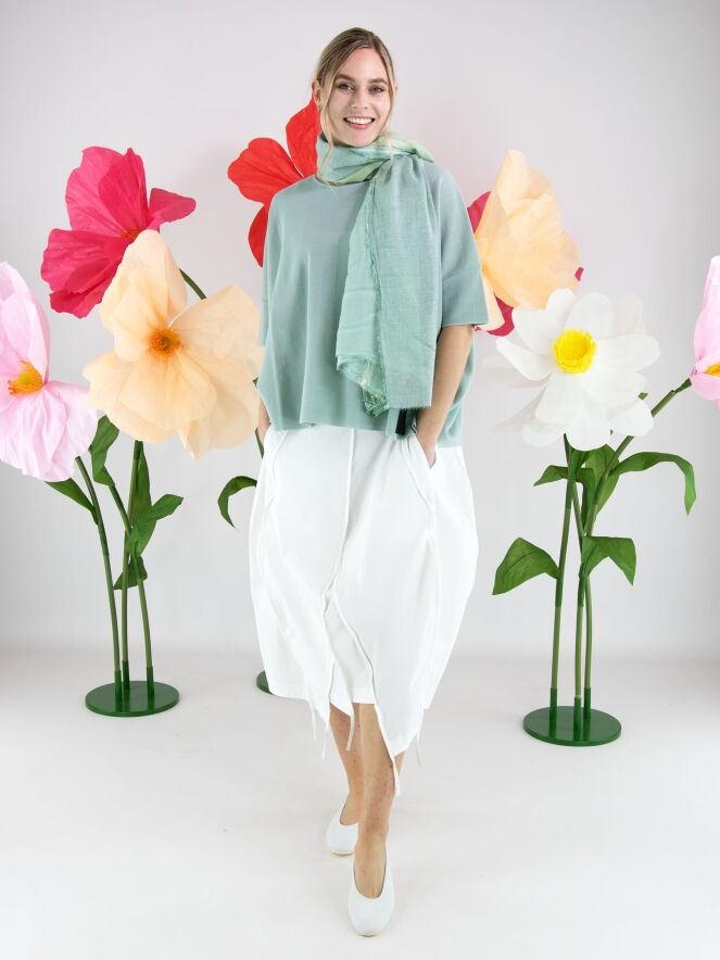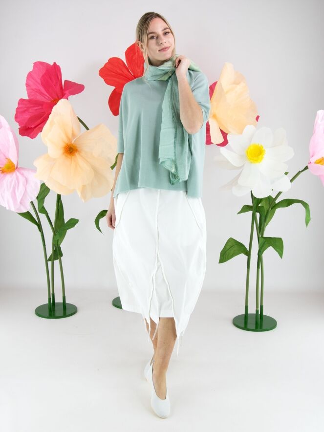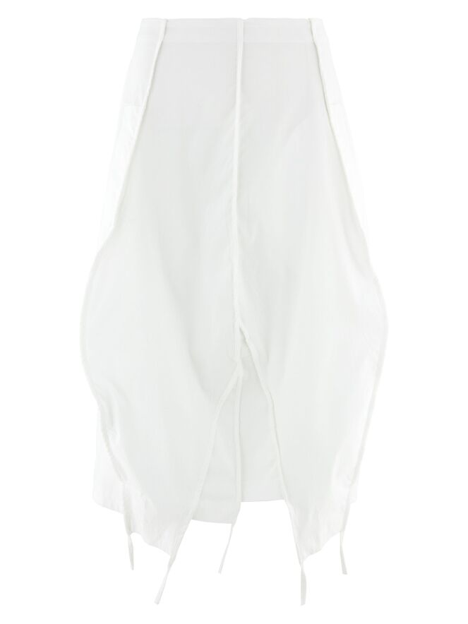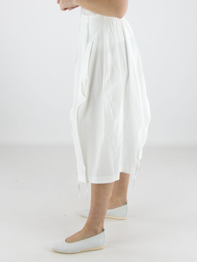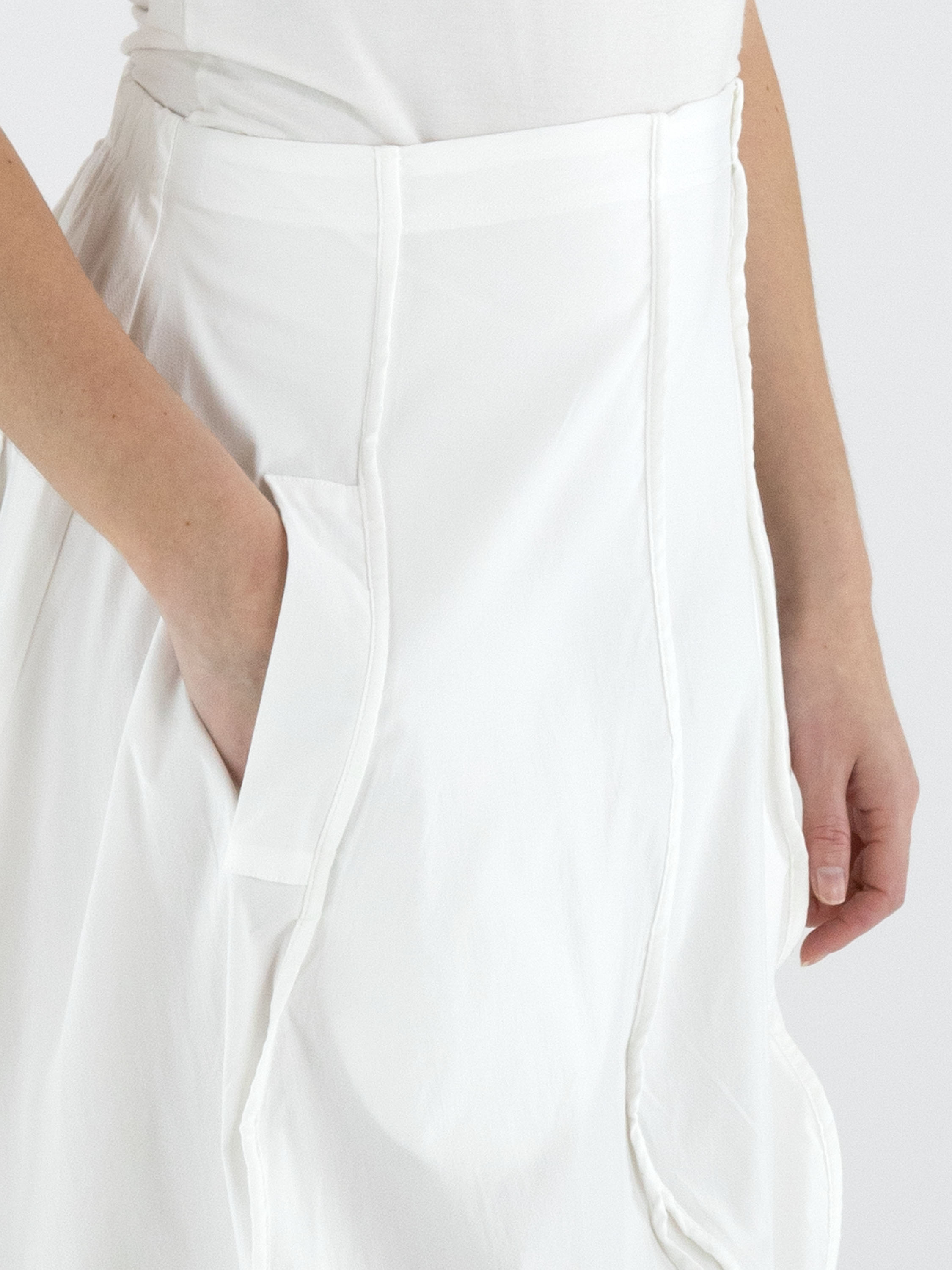 Rok van Rundholz Black Label in de kleur roomwit. In de taille is een fijn geplooide elastische band verwerkt, wat zorgt voor comfort en een soepele pasvorm. De rok loopt naar beneden toe uit in een lichte ballonvorm. Aan zowel de voor- als achterzijde zijn drie omgekeerde stiknaden met een bies aangebracht, waarvan een kort gedeelte onder de zoom zichtbaar is als een subtiel lintdetail. Direct onder de tailleband zijn steekzakken verwerkt. De rok is ongevoerd en kan op 30 graden worden gewassen.