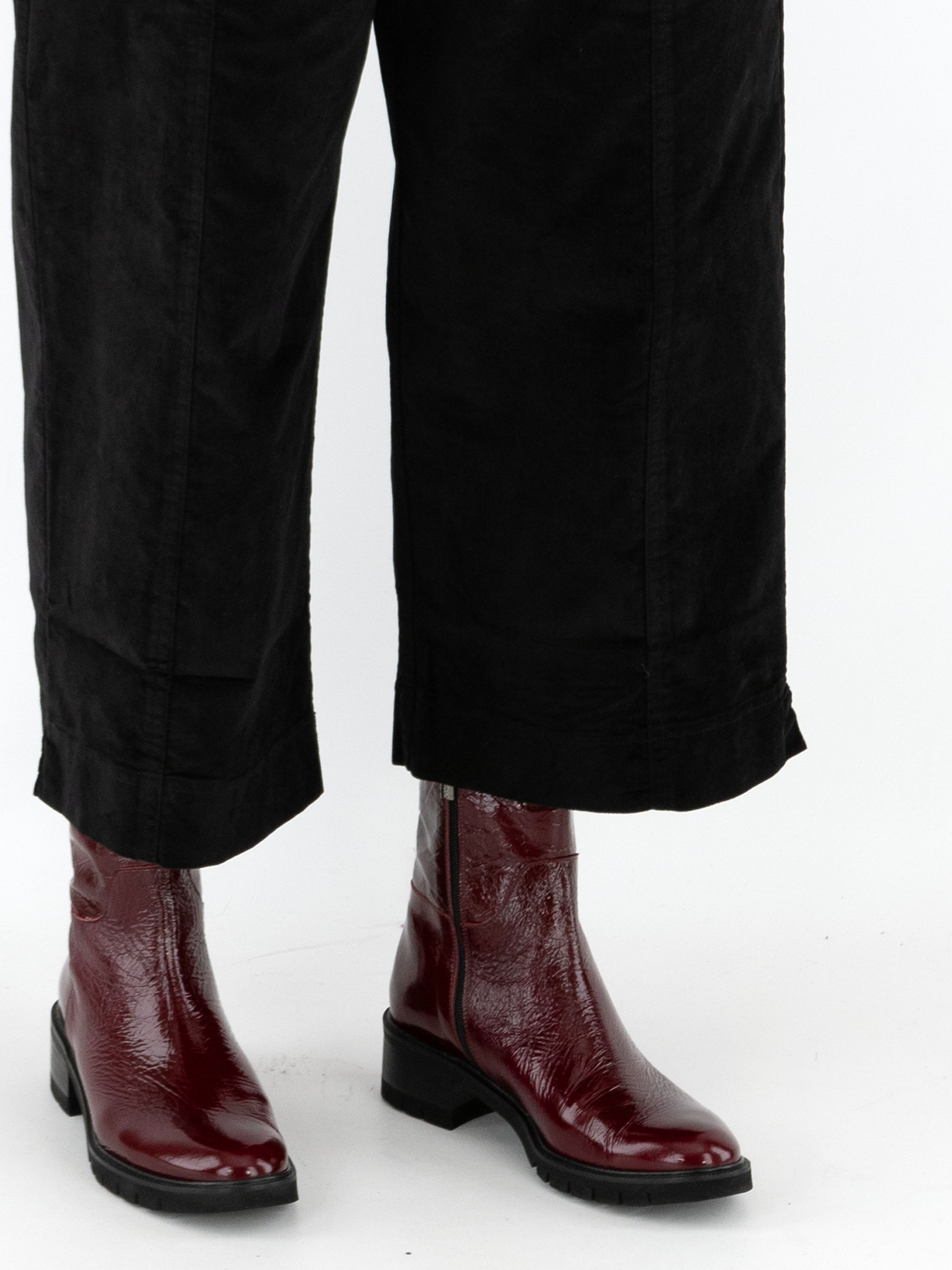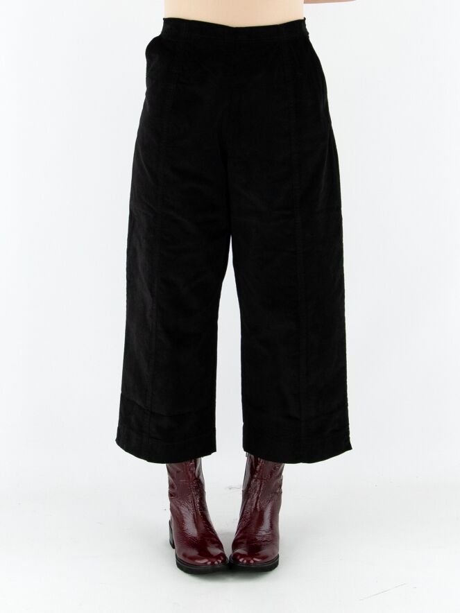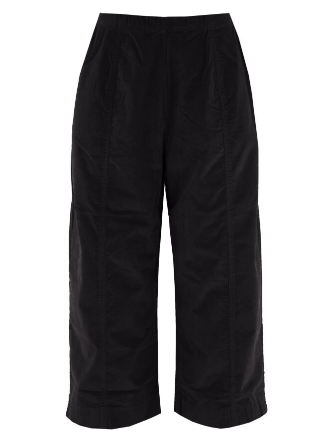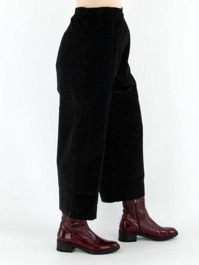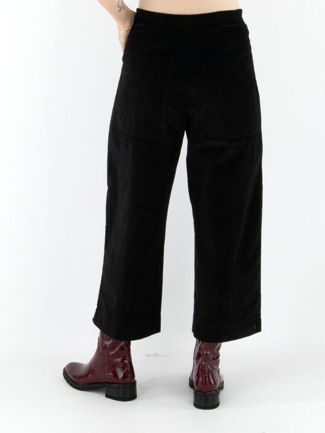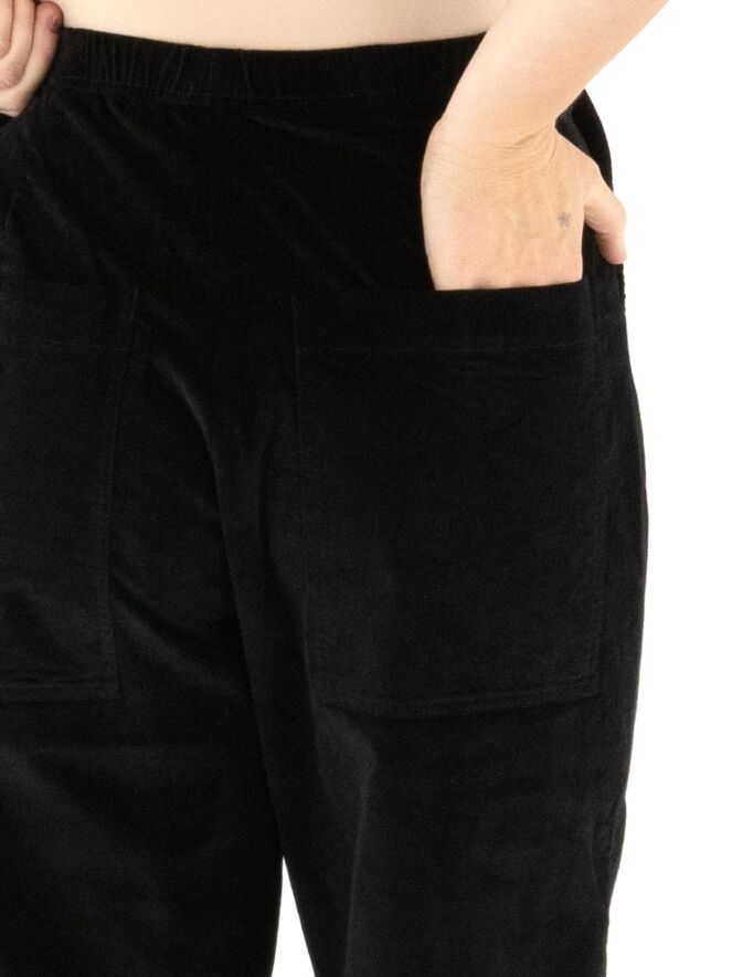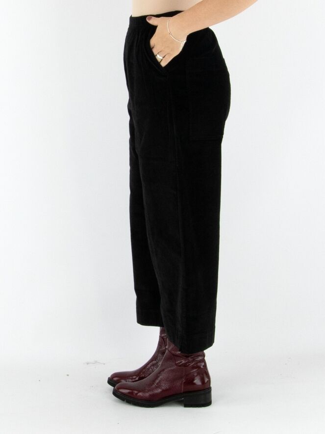 Een recht gesneden velours broek van Rundholz Black Label in de kleur zwart. De tailleband is elastisch. De broek heeft steekzakken en kan op 30 graden worden gewassen.