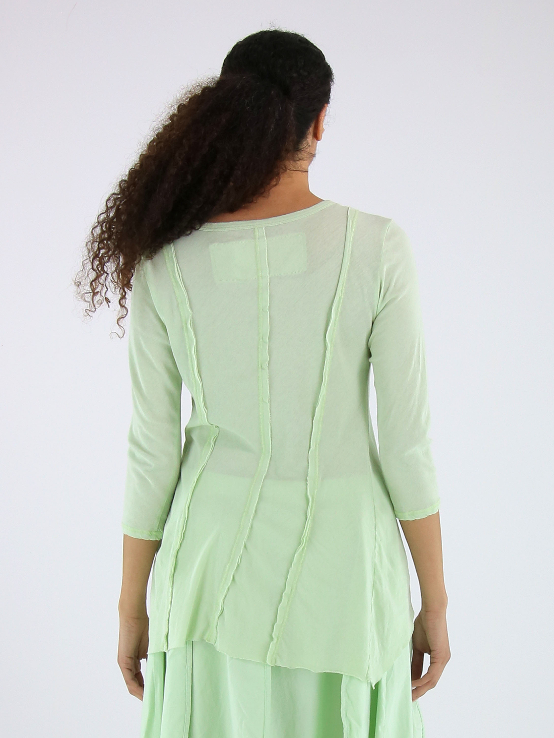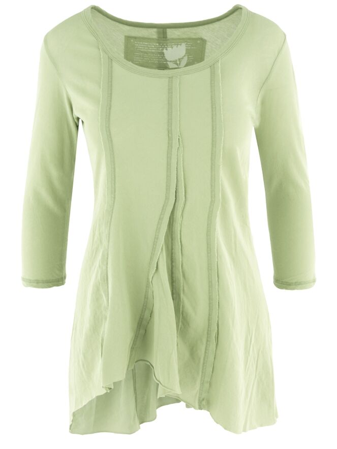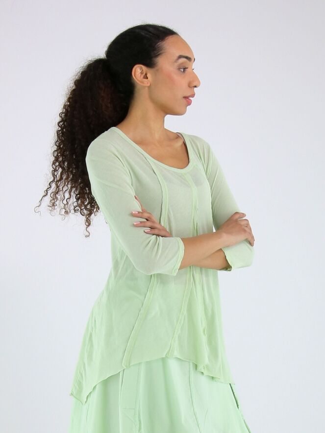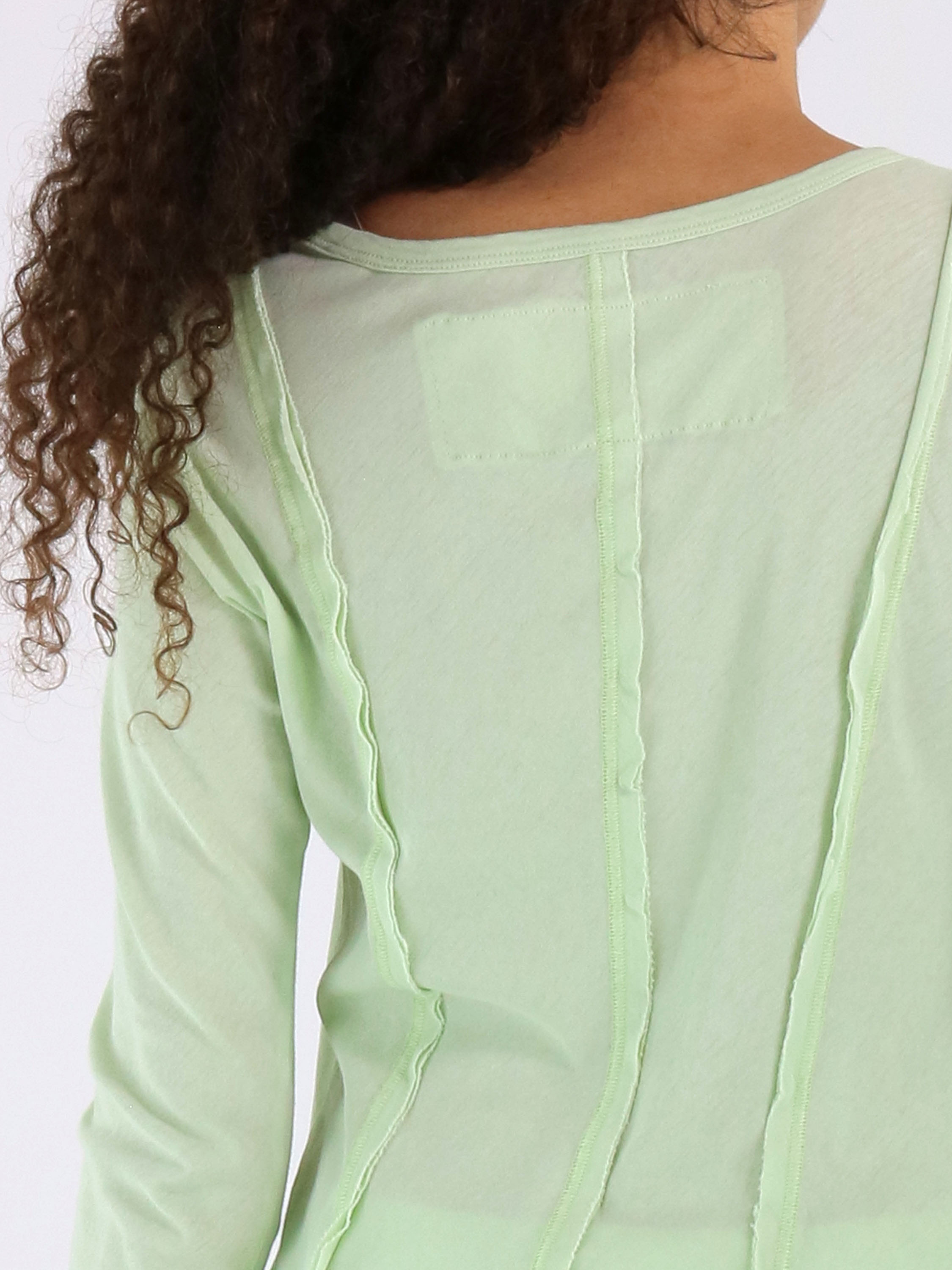 Slank gesneden shirt van Rundholz Black Label in een zachte pastel pistachegroene tint. Aan zowel de voor- als achterzijde zijn drie omgekeerde stiknaden verwerkt, die het ontwerp een subtiel architectonisch karakter geven. Het shirt heeft een ronde hals en halflange mouwen en kan op 30 graden worden gewassen.