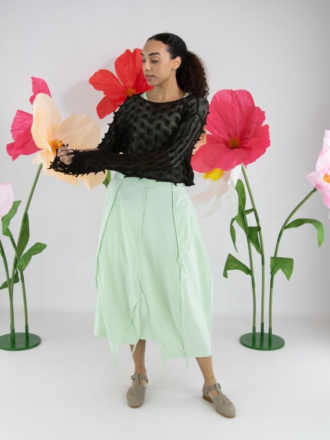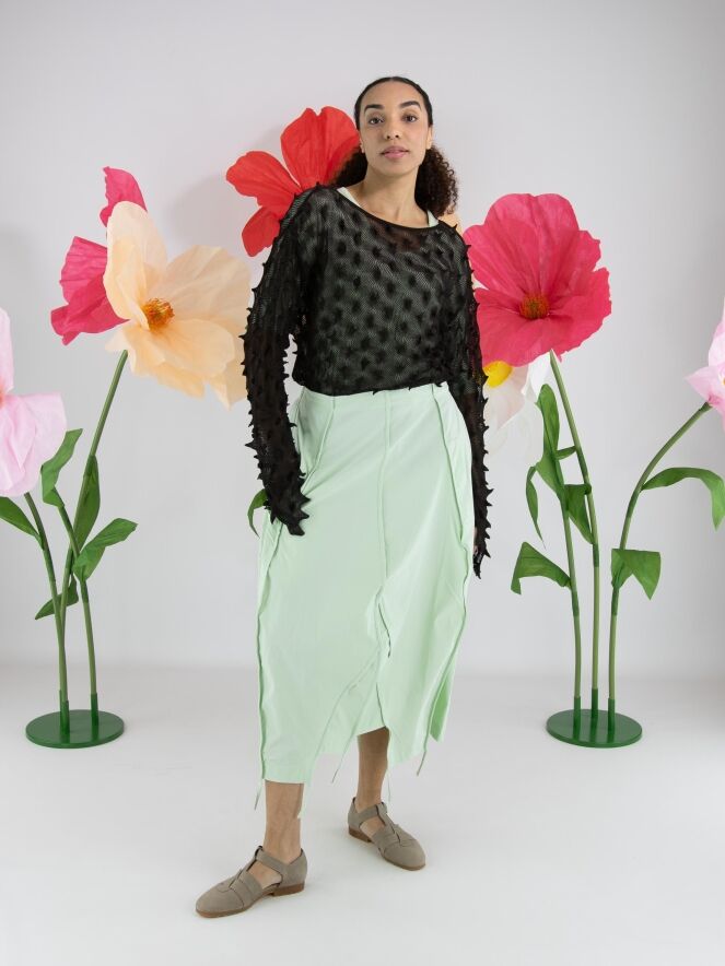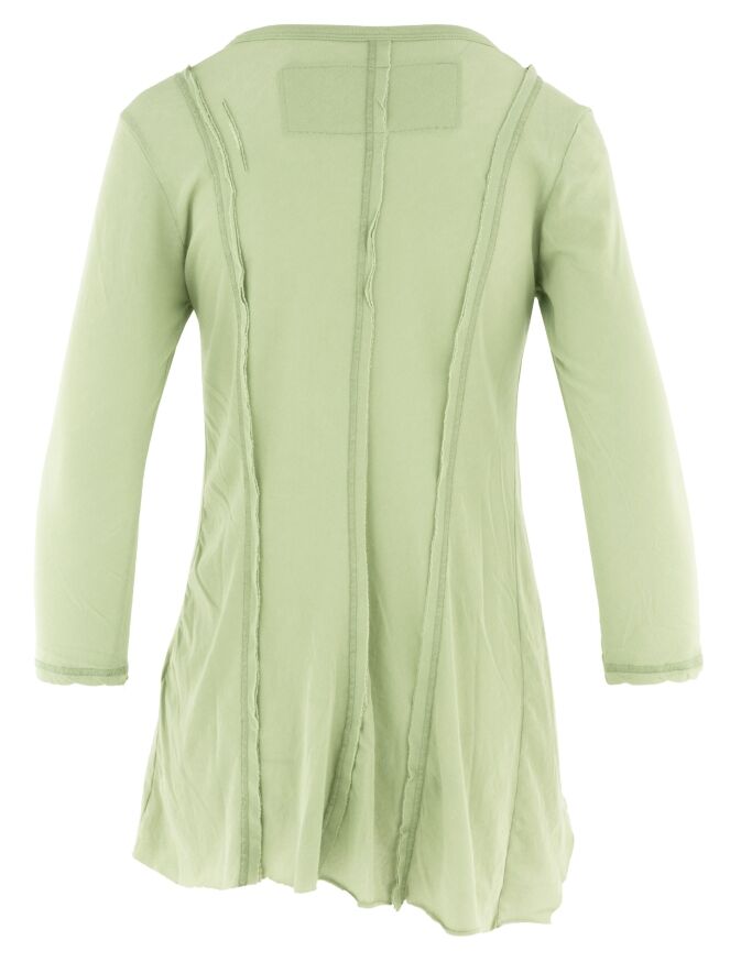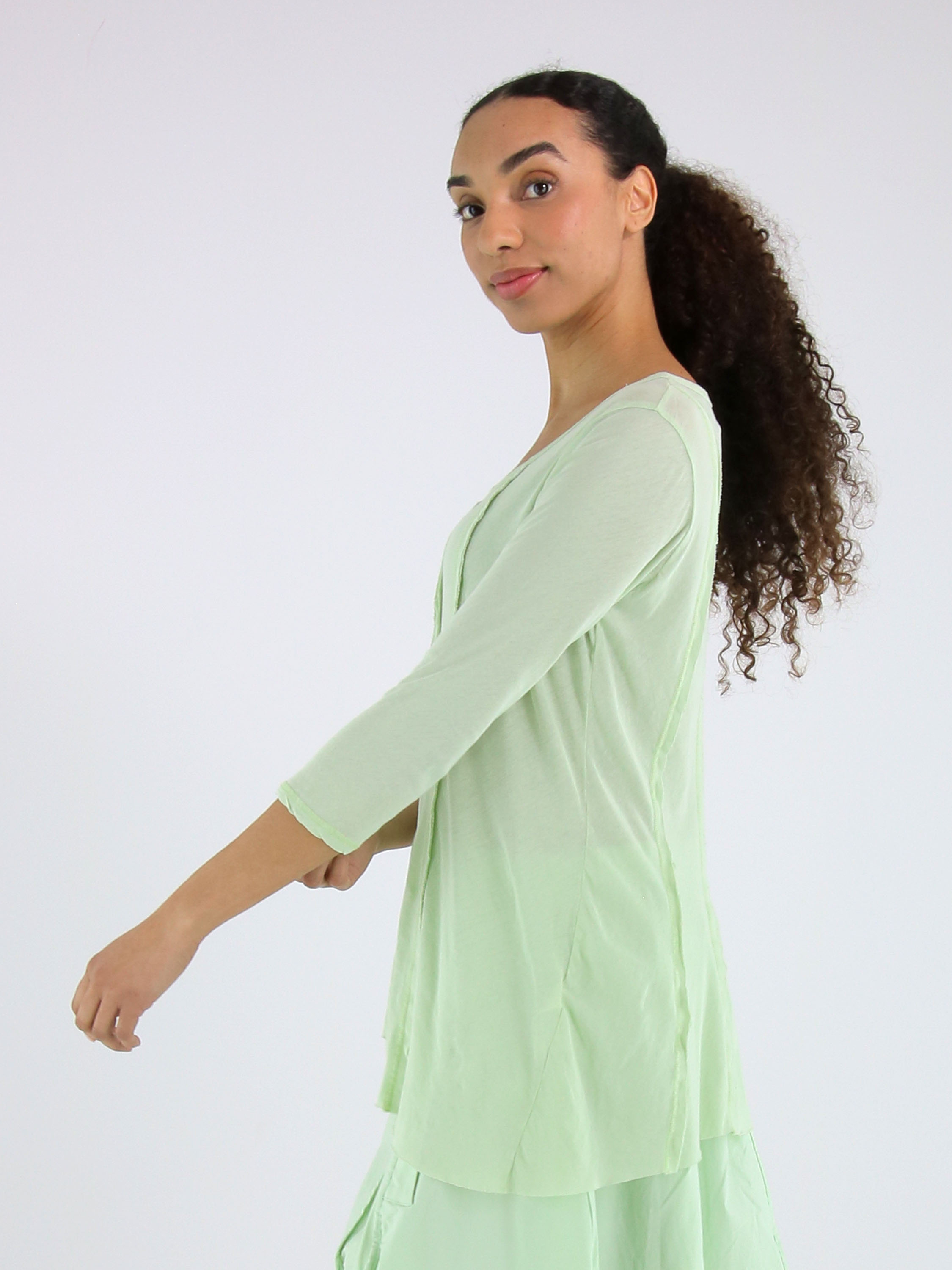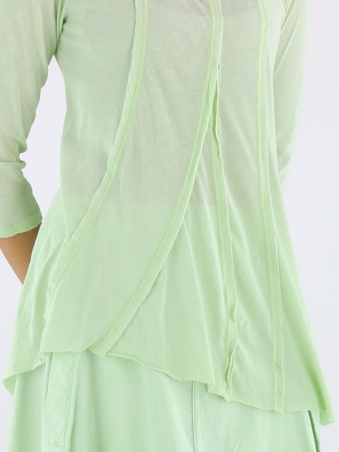 Slank gesneden shirt van Rundholz Black Label in een zachte pastel pistachegroene tint. Aan zowel de voor- als achterzijde zijn drie omgekeerde stiknaden verwerkt, die het ontwerp een subtiel architectonisch karakter geven. Het shirt heeft een ronde hals en halflange mouwen en kan op 30 graden worden gewassen.