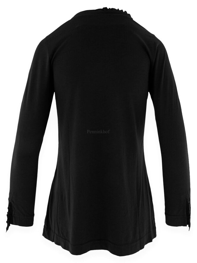 Een shirt van Rundholz black label in de kleur zwart. Langs de rand van de ronde hals is deels een fijn geplooide bies. Aan het uiteinde van de halflange mouwen is een splitje waarvan één rand fijn geplooid is. Dit shirt mag op 30 graden worden gewassen.