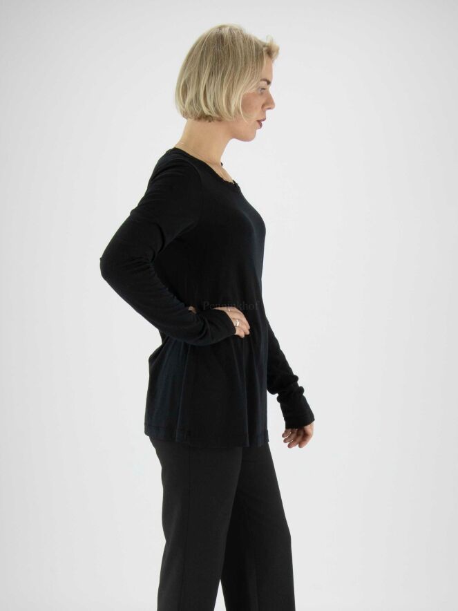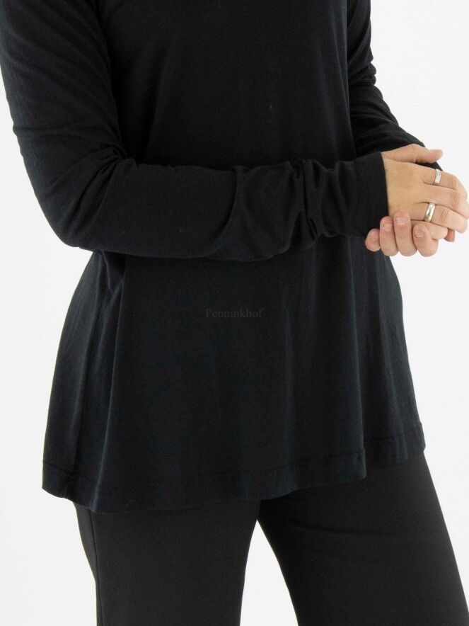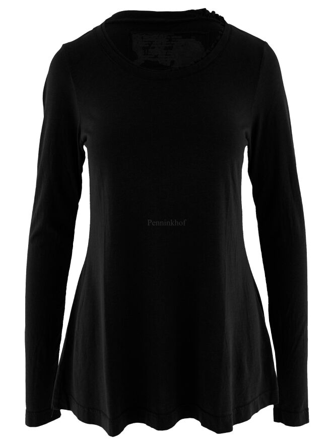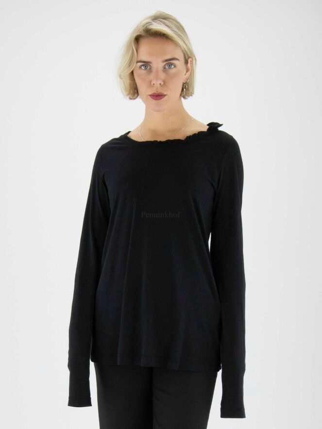 Een shirt van Rundholz black label in de kleur zwart. Langs de rand van de ronde hals is deels een fijn geplooide bies. Het shirt heeft lange mouwen en mag op 30 graden worden gewassen.