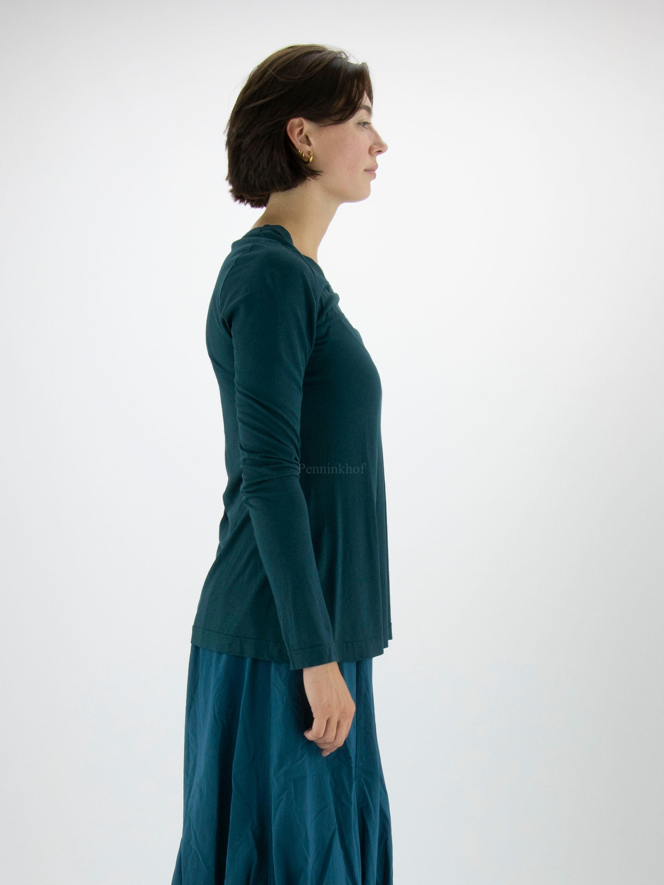 Een shirt van Rundholz black label in de kleur petrol blauw. Langs de rand van de ronde hals is deels een fijn geplooide bies. Het shirt heeft lange mouwen en mag op 30 graden worden gewassen.