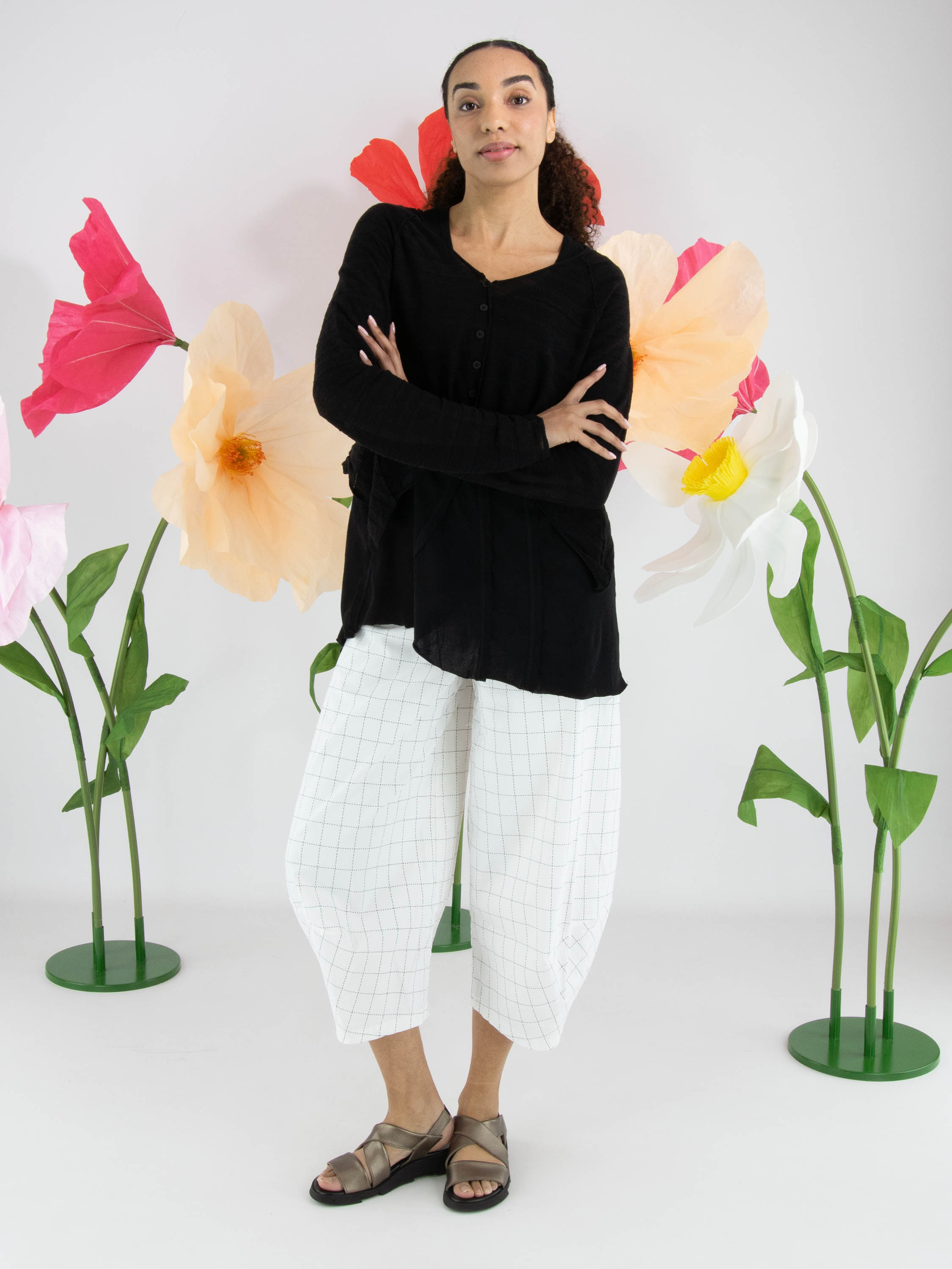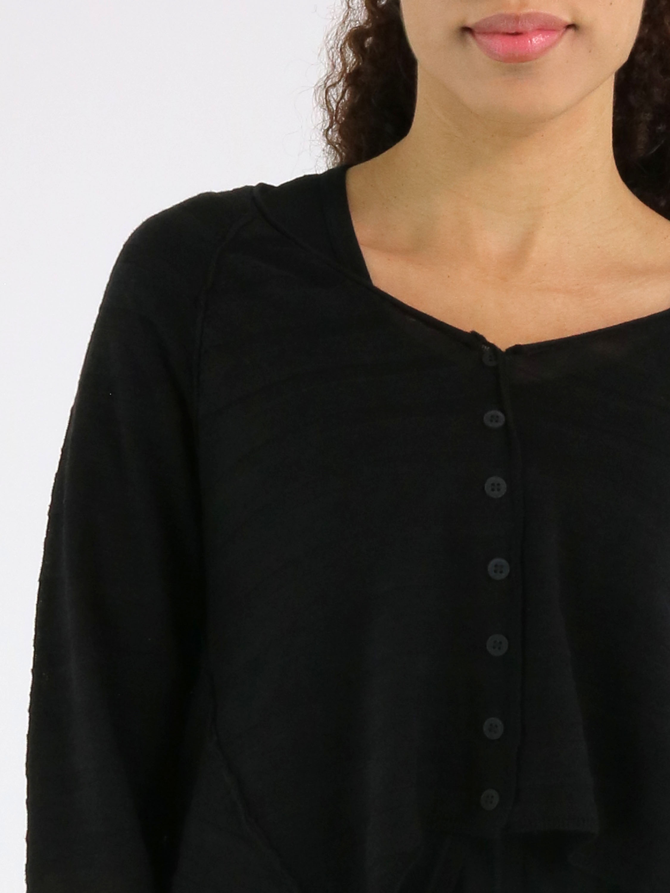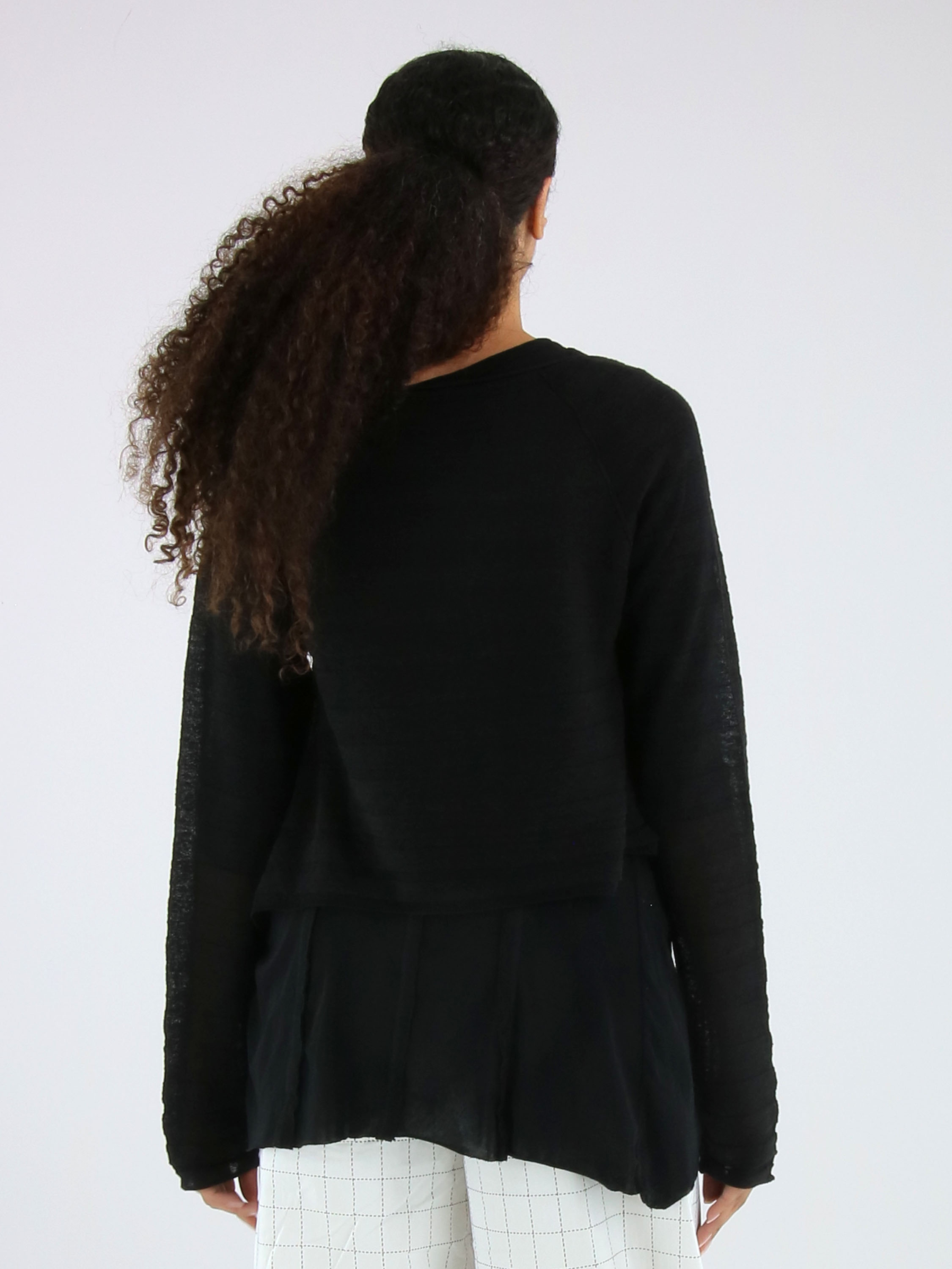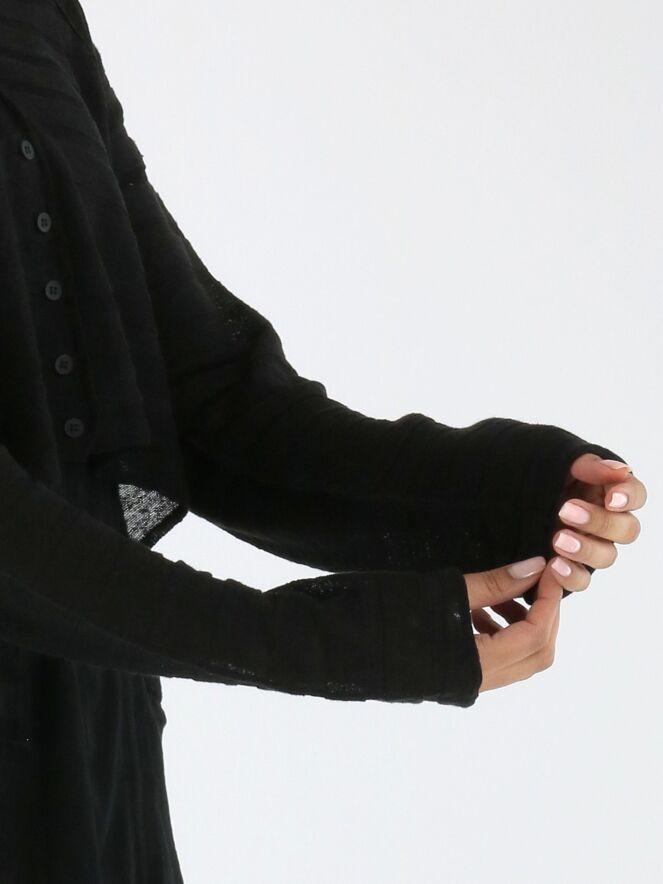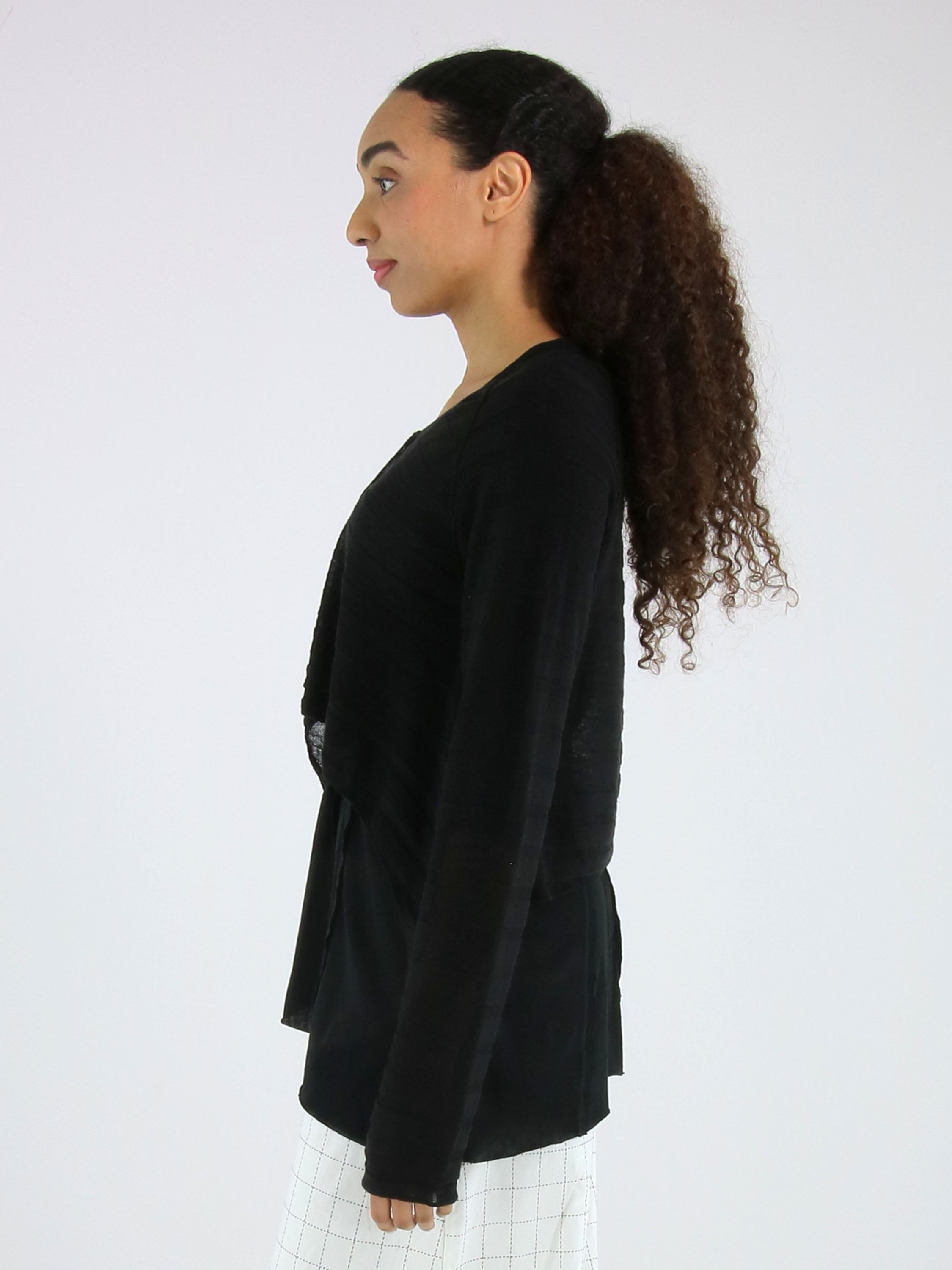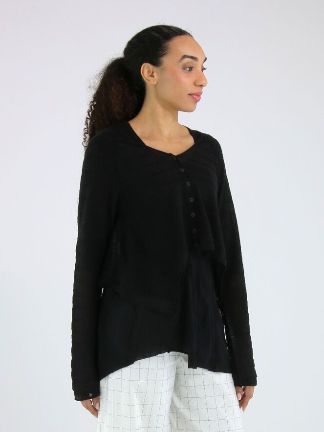 Kort, licht transparant vest van Rundholz Black Label in de kleur zwart. De stof heeft een subtiele gestreepte structuur, wat zorgt voor een verfijnd en modern effect. Aan de onderzijde zijn de zijkanten iets langer dan het middendeel, wat het silhouet een speelse en eigentijdse uitstraling geeft. Dit vest kan op 30 graden worden gewassen.