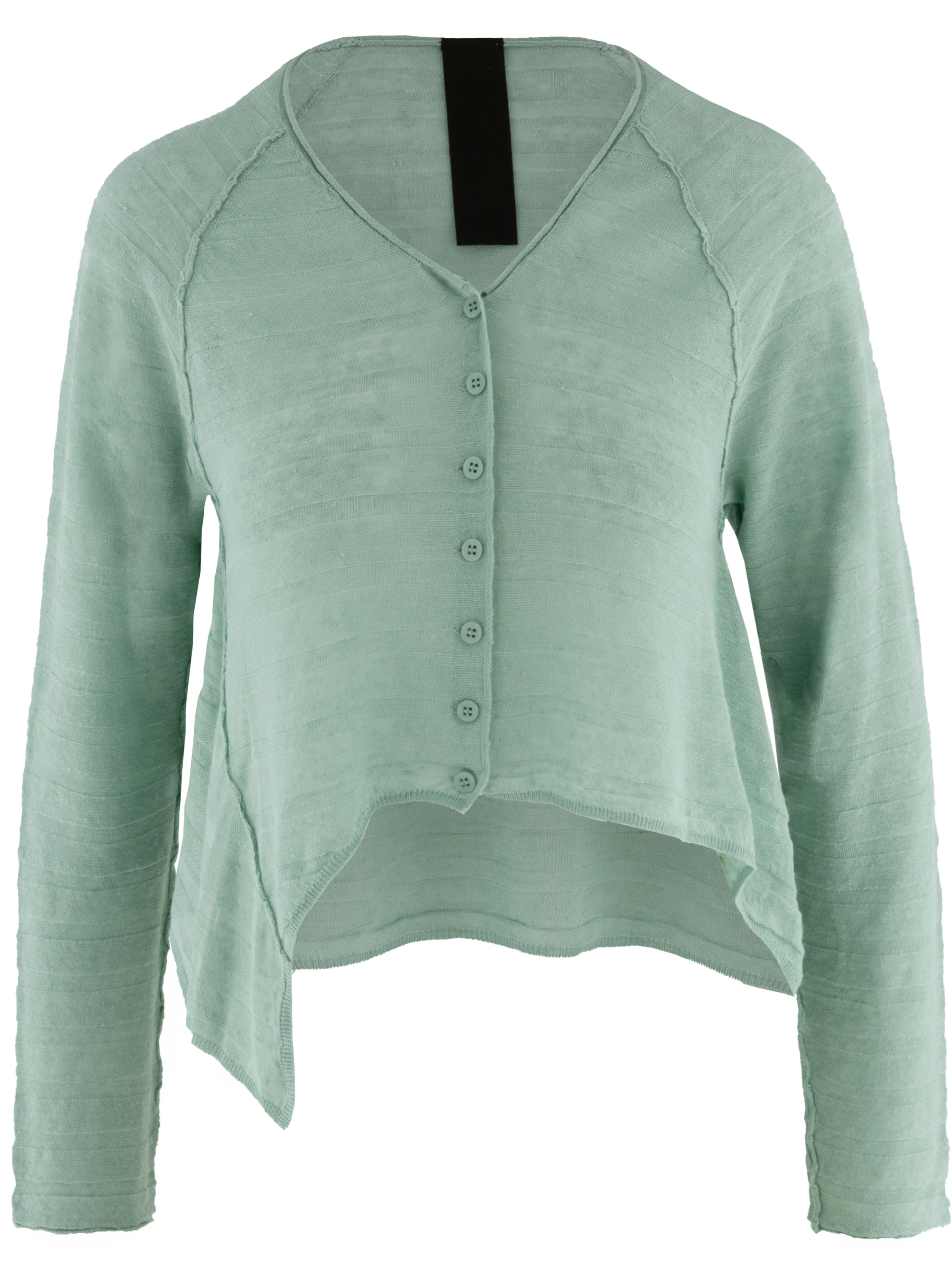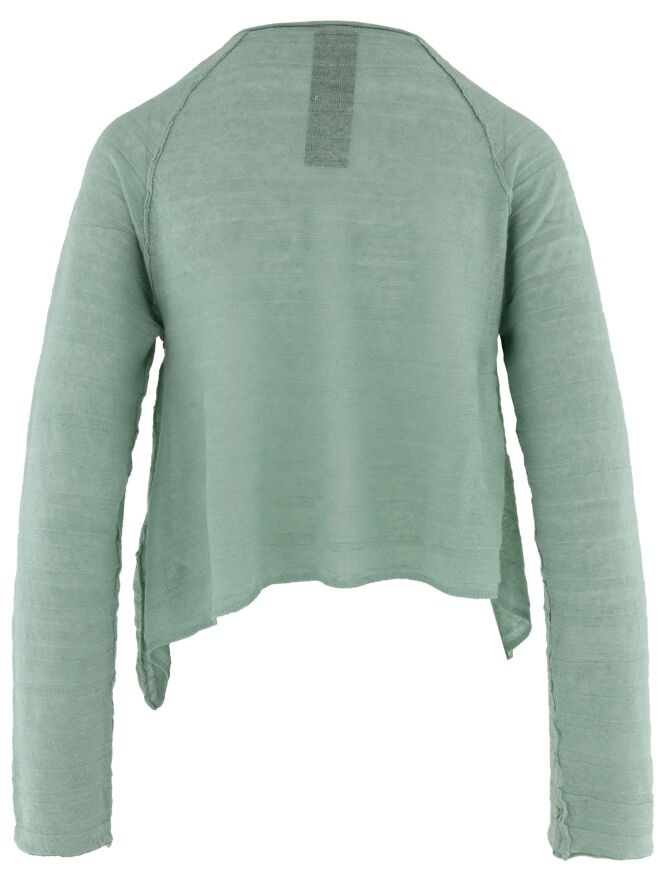 Kort licht transparant vest van Rundholz Black Label in een frisse mintgroene tint. De stof heeft een subtiele gestreepte structuur, wat zorgt voor een verfijnd en modern effect. Aan de onderzijde zijn de zijkanten iets langer dan het middendeel, waardoor een speels en eigentijds silhouet ontstaat. Dit exclusieve designervest kan op 30 graden worden gewassen.