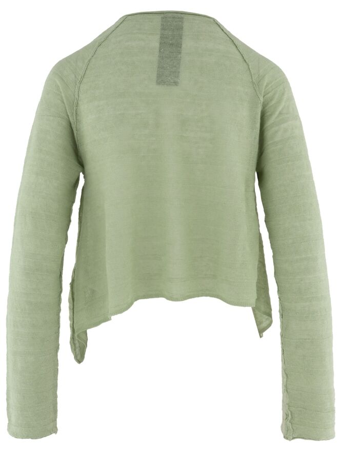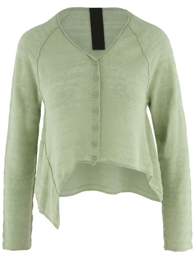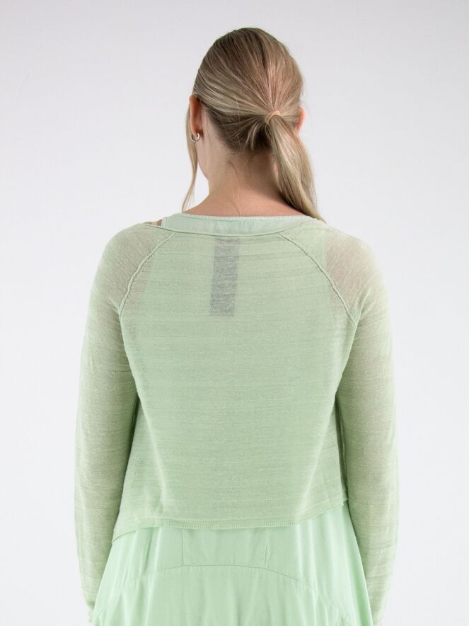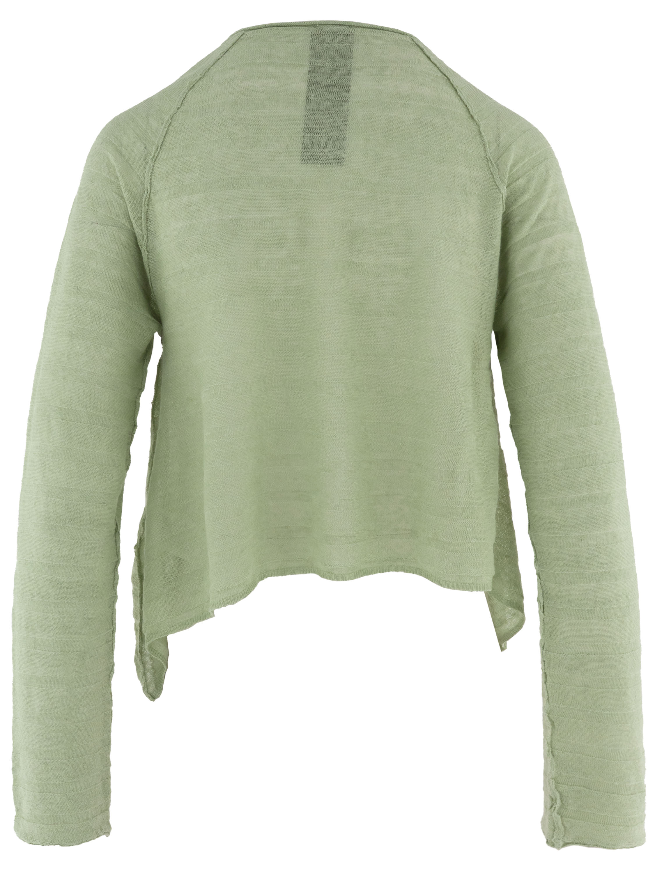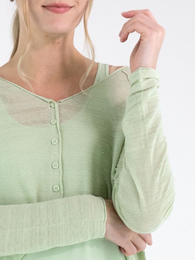 Kort, licht transparant vest van Rundholz Black Label in een frisse pistachegroene tint. De stof heeft een subtiele gestreepte structuur, wat het ontwerp een verfijnde en moderne uitstraling geeft. Aan de onderzijde zijn de zijkanten iets langer dan het middendeel, wat zorgt voor een speels en eigentijds silhouet. Dit exclusieve designer vest kan op 30 graden worden gewassen.